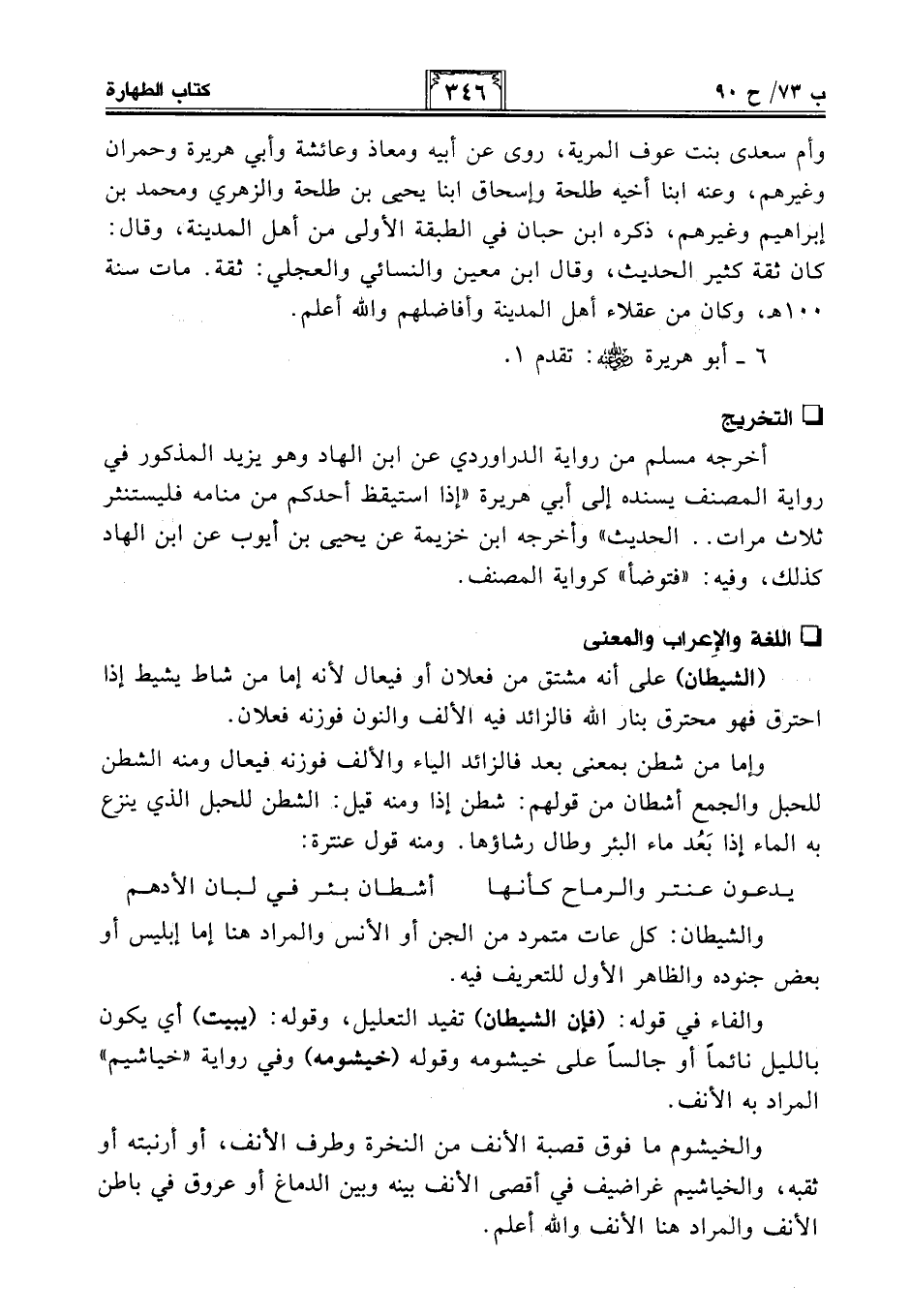 والفاء في قوله: (فإن الشيطان) تفيد التعليل، وقوله: (يبيت) أي يكون بالليل نائمًا أو جالسًا على خيشومه وقوله (خيشومه) وفي رواية "خياشيم" المراد به الأنف.