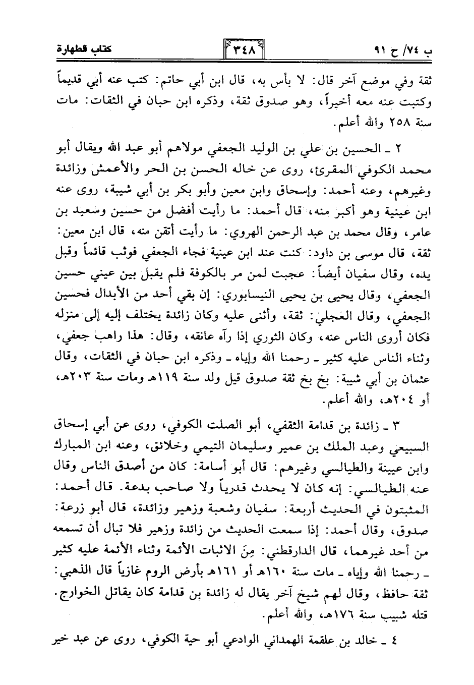 3 - زائدة بن قدامة الثقفي، أبو الصلت الكوفي، روى عن أبي إسحاق السبيعي وعبد الملك بن عمير وسليمان التيمي وخلائق، وعنه ابن المبارك وابن عيينة والطيالسي وغيرهم: قال أبو أسامة: كان من أصدق الناس وقال عنه الطيالسي: إنه كان لا يحدث قدريًا ولا صاحب بدعة. قال أحمد: المثبتون في الحديث أربعة: سفيان وشعبة وزهير وزائدة، قال أبو زرعة: صدوق، وقال أحمد: إذا سمعت الحديث من زائدة وزهير فلا تبال أن تسمعه من أحد غيرهما، قال الدارقطني: مِنَ الأثبات الأئمة وثناء الأئمة عليه كثير -رحمنا الله وإياه- مات سنة 160 هـ أو 161 هـ بأرض الروم غازيًا قال الذهبي: ثقة حافظ، وقال لهم شيخ آخر يقال له زائدة بن قدامة كان يقاتل الخوارج. قتله شبيب سنة 176 هـ، والله أعلم.