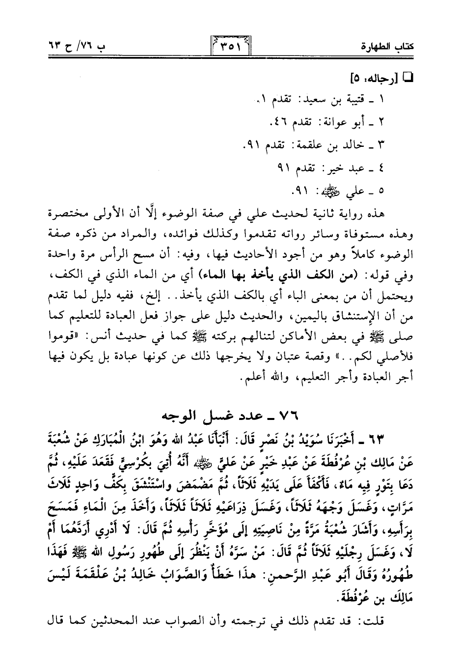 93 - أَخْبَرَنَا سُوَيْدُ بْنُ نَصْرٍ قَالَ: أَنْبَأَنَا عَبْدُ اللَّهِ وَهُوَ ابْنُ الْمُبَارَكِ عَنْ شُعْبَةَ عَنْ مَالِكِ بْنِ عُرْفُطَةَ عَنْ عَبْدِ خَيْرٍ عَنْ عَلِيٍّ - رضي الله عنه - أَنَّهُ أُتِيَ بِكُرْسِيٍّ فَقَعَدَ عَلَيْهِ، ثُمَّ دَعَا بِتَوْرٍ فِيهِ مَاءٌ، فَأكفَأَ عَلَى يَدَيْهٍ ثَلَاثًا، ثُمَّ مَضْمَضَ وَاسْتَنْشَقَ بِكَفٍّ وَاحِدٍ ثَلَاثَ مَرَّاتٍ، وَغَسَلَ وَجْهَهُ ثَلَاثًا، وَغَسَلَ ذِرَاعَيْهِ ثَلَاثًا ثَلَاثًا، وَأَخَذَ مِنَ الْمَاءِ فَمَسَحَ بِرَأْسِهِ، وَأَشَارَ شُعْبَةُ مَرَّةً مِنْ نَاصِيَتِهِ إِلَى مُؤَخَّرِ رَأْسِهِ ثُمَّ قَالَ: لَا أَدْرِي أَرَدَّهُمَا أَمْ لَا، وَغَسَلَ رِجْلَيْهِ ثَلَاثًا ثُمَّ قَالَ: مَنْ سَرَّهُ أَنْ يَنْظُرَ إِلَى طُهُورِ رَسُولِ اللَّهِ - صلى الله عليه وسلم - فَهَذَا طُهُورُهُ. وَقَالَ أَبُو عَبْدِ الرَّحْمَنِ: هَذَا خَطَأٌ وَالصَّوَابُ خَالِدُ بْنُ عَلْقَمَةَ لَيْسَ مَالِكَ بْنَ عُرْفُطَةَ.