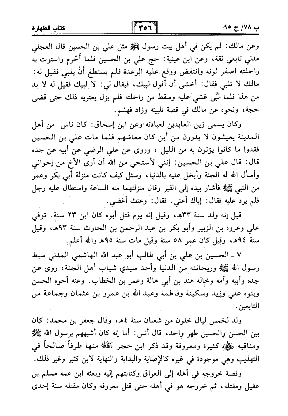 وعن مالك: لم يكن في أهل بيت رسول الله - صلى الله عليه وسلم - مثل علي بن الحسين قال العجلي مدني تابعي ثقة، وعن ابن عينية: حج علي بن الحسين فلما أَحْرم واستوت به راحلته اصفر لونه وانتفض ووقع عليه الرعدة فلم يستطع أَنْ يلبي فقيل له: مالك لا تلبي فقال: أخشى أن أقول لبيك، فيقال لي: لا لبيك فقيل له لابد من هذا فلما لبَّى غشي عليه وسقط من راحلته فلم يزل يعتريه ذلك حتى قضى حجة، ونحوه عن مالك في قصة تلبيته وزاد فهشم.