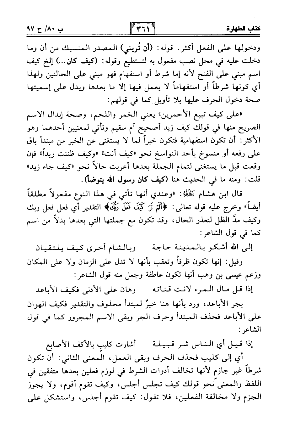 "على كيف تبيع الأحمرين" يعني الخمر واللحم، وصحة إبدال الاسم الصريح منها في قولك كيف زيد أصحيح أم سقيم وتأتي لمعنيين أحدهما وهو الأكثر: أن تكون استفهامية فتكون خبرًا لما لا يستغنى عن الخبر من مبتدأ باق على رفعه أو منسوخ بأحد النواسخ نحو "كيف أنت" "وكيف ظننت زيدًا" فإن وقعت قبل ما يستغنى لتمام الجملة بعدها أعربت حالًا نحو "كيف جاء زيد" قلت: ومنه ما في الحديث هنا (كيف كان رسول الله يتوضأ).