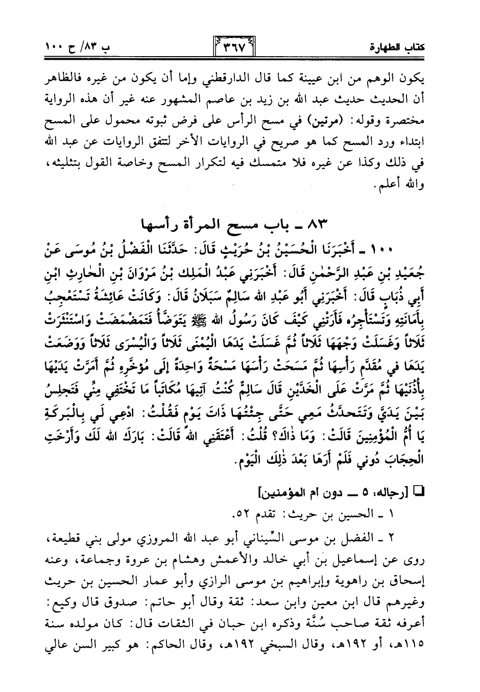 يكون الوهم من ابن عيينة كما قال الدارقطني وإما أن يكون من غيره فالظاهر أن الحديث حديث عبد الله بن زيد بن عاصم المشهور عنه غير أن هذه الرواية مختصرة وقوله: (مرتين) في مسح الرأس على فرض ثبوته محمول على المسح ابتداء ورد المسح كما هو صريح في الروايات الأخر لتتفق الروايات عن عبد الله في ذلك وكذا عن غيره فلا متمسك فيه لتكرار المسح وخاصة القول بتثليثه، والله أعلم.