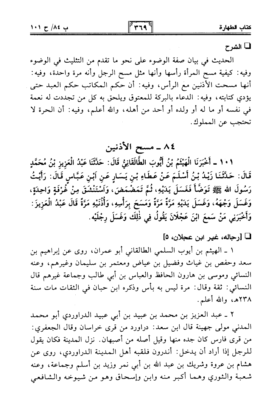 الحديث في بيان صفة الوضوء على نحو ما تقدم من التثليث في الوضوء وفيه: كيفية مسح المرأة رأسها وأنها مثل مسح الرجل وأنه مرة واحدة، وفيه: أنها مسحت الأذنين مع الرأس، وفيه: أن حكم المكاتب حكم العبد حتى يؤدي كتابته، وفيه: الدعاء بالبركة للمعتوق ويلحق به كل من تجددت له نعمة في نفسه أو ماله أو ولده أو أحد من أهله، والله أعلم، وفيه: أن الحرة لا تحتجب عن المملوك.
