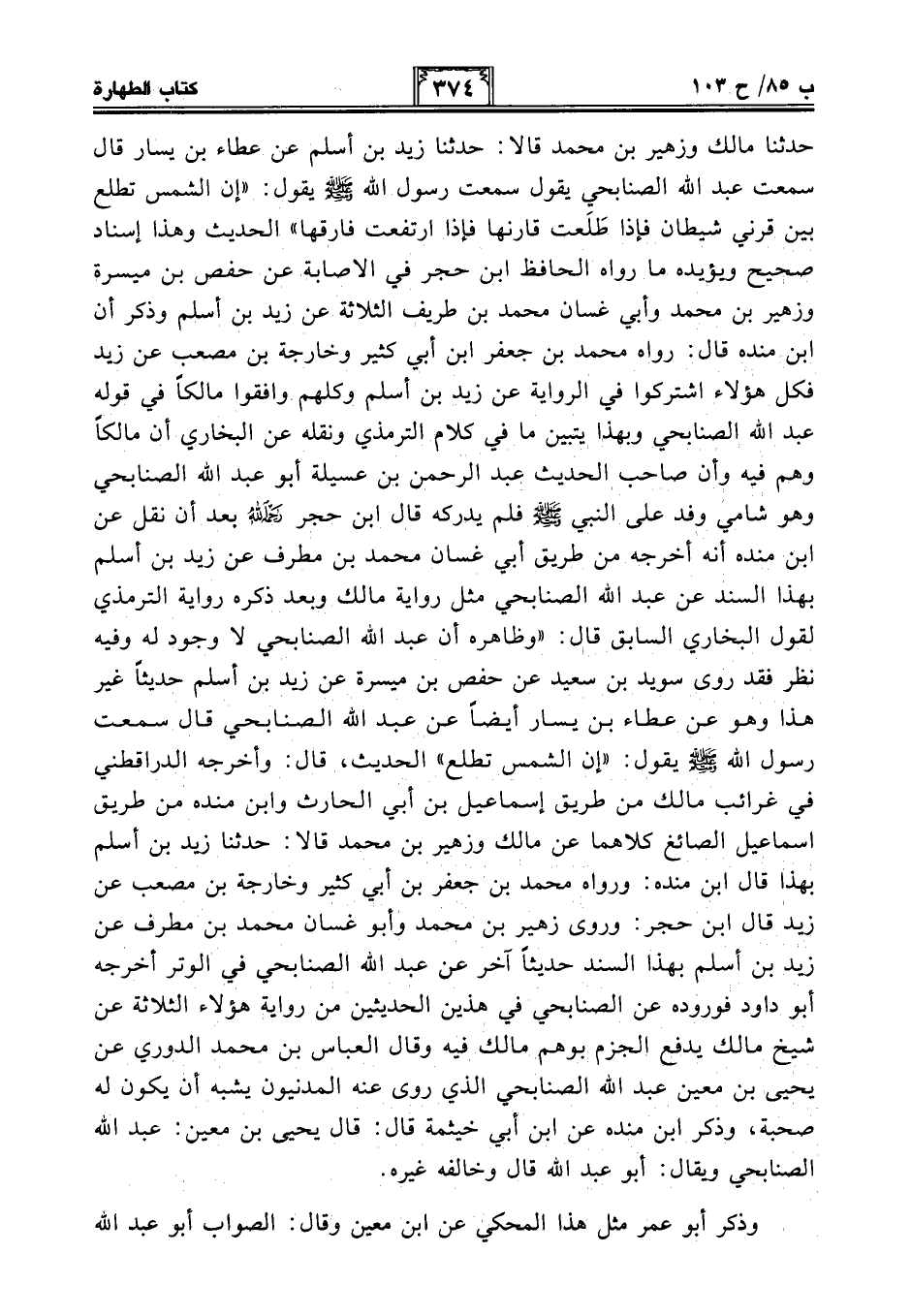 حدثنا مالك وزهير بن محمَّد قالا: حدثنا زيد بن أسلم عن عطاء بن يسار قال سمعت عبد الله الصنابحي يقول سمعت رسول الله - صلى الله عليه وسلم - يقول: "إن الشمس تطلع بين قرني شيطان فإذا طَلَعت قارنها فإذا ارتفعت فارقها" الحديث وهذا إسناد صحيح ويؤيده ما رواه الحافظ ابن حجر في الإصابة عن حفص بن ميسرة وزهير بن محمَّد وأبي غسان محمَّد بن طريف الثلاثة عن زيد بن أسلم وذكر أن ابن منده قال: رواه محمَّد بن جعفر ابن أبي كثير وخارجة بن مصعب عن زيد فكل هؤلاء اشتركوا في الرواية عن زيد بن أسلم وكلهم وافقوا مالكًا في قوله عبد الله الصنابحي وبهذا يتبين ما في كلام الترمذي ونقله عن البخاري أن مالكًا وهم فيه وأن صاحب الحديث عبد الرحمن بن عسيلة أبو عبد الله الصنابحي وهو شامي وفد على النبي - صلى الله عليه وسلم - فلم يدركه قال ابن حجر -رحمه الله- بعد أن نقل عن ابن منده أنه أخرجه من طريق أبي غسان محمَّد بن مطرف عن زيد بن أسلم بهذا السند عن عبد الله الصنابحي مثل رواية مالك وبعد ذكره رواية الترمذي لقول البخاري السابق قال: "وظاهره أن عبد الله الصنابحي لا وجود له وفيه نظر فقد روى سويد بن سعيد عن حفص بن ميسرة عن زيد بن أسلم حديثًا غير هذا وهو عن عطاء بن يسار أيضًا عن عبد الله الصنابحي قال سمعت رسول الله - صلى الله عليه وسلم - يقول: "إن الشمس تطلع" الحديث، قال: وأخرجه الدارقطني في غرائب مالك من طريق إسماعيل بن أبي الحارث وابن منده من طريق إسماعيل الصائغ كلاهما عن مالك وزهير بن محمَّد قالا: حدثنا زيد بن أسلم بهذا قال ابن منده: ورواه محمَّد بن جعفر بن أبي كثير وخارجة بن مصعب عن زيد قال ابن حجر: وروى زهير بن محمَّد وأبو غسان محمَّد بن مطرف عن زيد بن أسلم بهذا السند حديثًا آخر عن عبد الله الصنابحي في الوتر أخرجه أبو داود فوروده عن الصنابحي في هذين الحديثين من رواية هؤلاء الثلاثة عن شيخ مالك يدفع الجزم بوهم مالك فيه وقال العباس بن محمَّد الدوري عن يحيى بن معين عبد الله الصنابحي الذي روى عنه المدنيون يشبه أن يكون له صحبة، وذكر ابن منده عن ابن أبي خيثمة قال: قال يحيى بن معين: عبد الله الصنابحي ويقال: أبو عبد الله قال وخالفه غيره.