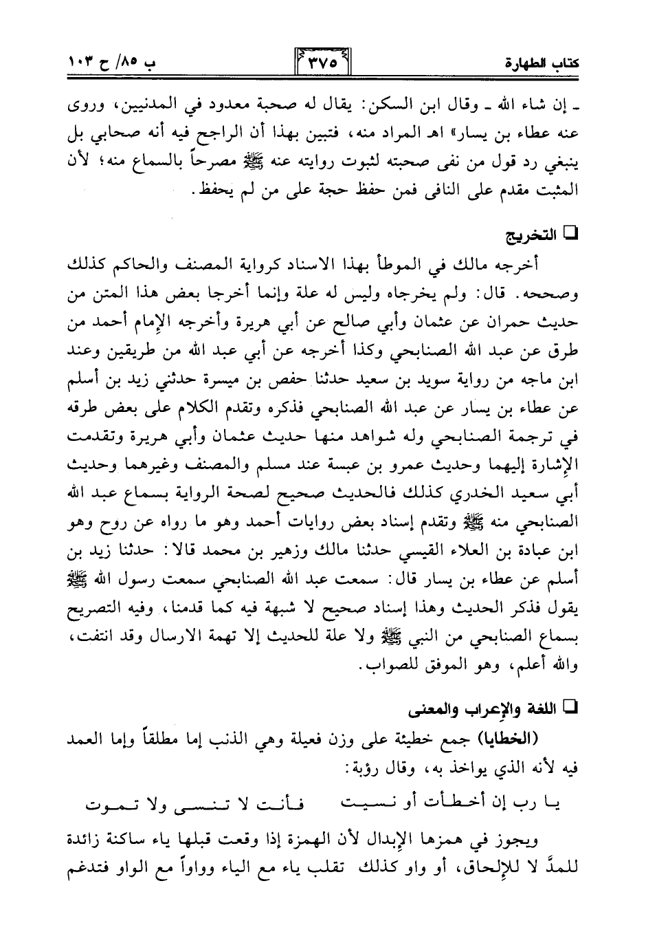 أخرجه مالك في الموطأ بهذا الإسناد كرواية المصنف والحاكم كذلك وصححه. قال: ولم يخرجاه وليس له علة وإنما أخرجا بعض هذا المتن من حديث حمران عن عثمان وأبي صالح عن أبي هريرة وأخرجه الإِمام أحمد من طرق عن عبد الله الصنابحي وكذا أخرجه عن أبي عبد الله من طريقين وعند ابن ماجه من رواية سويد بن سعيد حدثنا حفص بن ميسرة حدثني زيد بن أسلم عن عطاء بن يسار عن عبد الله الصنابحي فذكره وتقدم الكلام على بعض طرقه في ترجمة الصنابحي وله شواهد منها حديث عثمان وأبي هريرة وتقدمت الإِشارة إليهما وحديث عمرو بن عبسة عند مسلم والمصنف وغيرهما وحديث أبي سعيد الخدري كذلك فالحديث صحيح لصحة الرواية بسماع عبد الله الصنابحي منه - صلى الله عليه وسلم - وتقدم إسناد بعض روايات أحمد وهو ما رواه عن روح وهو ابن عبادة بن العلاء القيسي حدثنا مالك وزهير بن محمَّد قالا: حدثنا زيد بن أسلم عن عطاء بن يسار قال: سمعت عبد الله الصنابحي سمعت رسول الله - صلى الله عليه وسلم - يقول فذكر الحديث وهذا إسناد صحيح لا شبهة فيه كما قدمنا، وفيه التصريح بسماع الصنابحي من النبي - صلى الله عليه وسلم - ولا علة للحديث إلا تهمة الإرسال وقد انتفت، والله أعلم، وهو الموفق للصواب.
