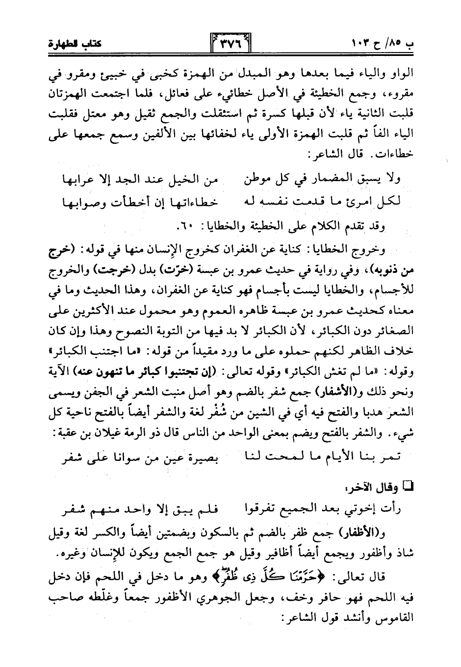 وخروج الخطايا: كناية عن الغفران كخروج الإِنسان منها في قوله: (خرج من ذنوبه)، وفي رواية في حديث عمرو بن عبسة (خرّت) بدل (خرجت) والخروج للأجسام، والخطايا ليست بأجسام فهو كناية عن الغفران، وهذا الحديث وما في معناه كحديث عمرو بن عبسة ظاهره العموم وهو محمول عند الأكثرين على الصغائر دون الكبائر, لأن الكبائر لابد فيها من التوبة النصوح وهذا وإن كان خلاف الظاهر لكنهم حملوه على ما ورد مقيدًا من قوله: "ما اجتنب الكبائر" وقوله: "ما لم تغش الكبائر" وقوله تعالى: {إِنْ تَجْتَنِبُوا كَبَائِرَ مَا تُنْهَوْنَ عَنْهُ} الآية ونحو ذلك و (الأشفار) جمع شفر بالضم وهو أصل منبت الشعر في الجفن ويسمى الشعر هدبا والفتح فيه أي في الشين من شُفْر لغة والشفر أيضًا بالفتح ناحية كل شيء. والشفر بالفتح ويضم بمعنى الواحد من الناس قال ذو الرمة غيلان بن عقبة: