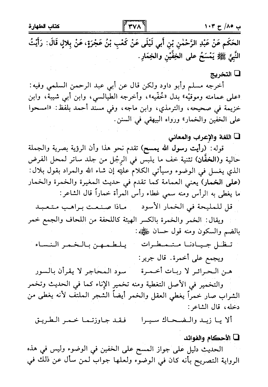 الْحَكَمِ عَنْ عَبْدِ الرَّحْمَنِ بْنِ أَبِي لَيْلَى عَنْ كَعْبِ بْنِ عُجْرَةَ، عَنْ بِلَالٍ قَالَ: رَأَيْتُ النَّبِيَّ - صلى الله عليه وسلم - يَمْسَحُ عَلَى الْخِفَّيْنِ وَالْخِمَارِ.