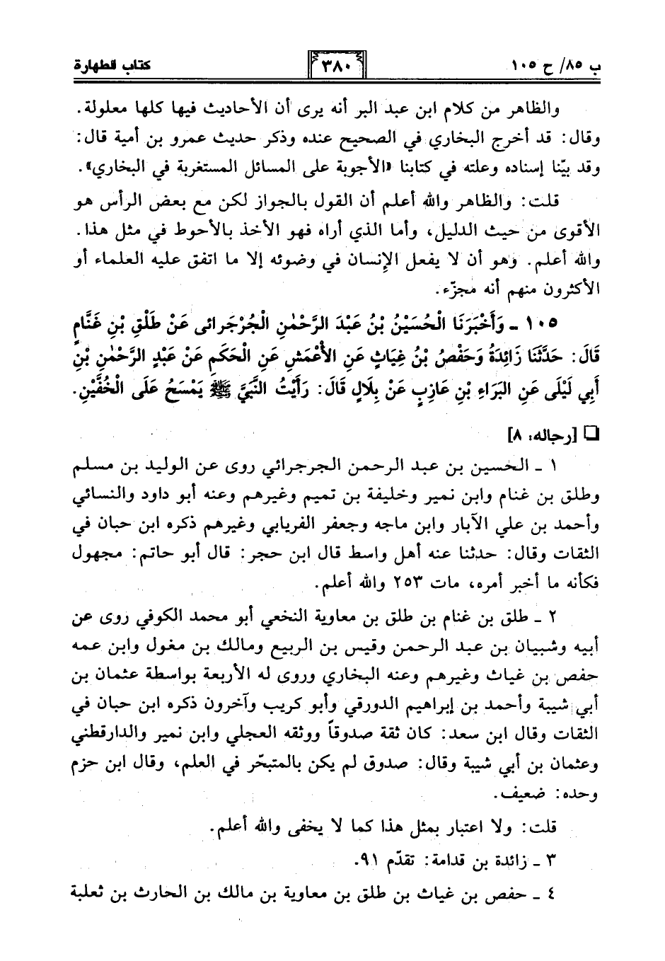 105 - وَأَخْبَرَنَا الْحُسَيْنُ بْنُ عَبْدِ الرَّحْمَنِ الْجَرْجَرَائِيُّ عَنْ طَلْقِ بْنِ غَنَّامٍ قَالَ: حَدَّثَنَا زَائِدَةُ وَحَفْصُ بْنُ غِيَاثٍ عَنِ الأَعْمَشِ عَنِ الْحَكَمِ عَنْ عَبْدِ الرَّحْمَنِ بْنِ أَبِي لَيْلَى عَنِ الْبَرَاءِ بْنِ عَازِبٍ عَنْ بِلَالٍ قَالَ: رَأَيْتُ النبي - صلى الله عليه وسلم - يَمْسَحُ عَلَى الْخُفَّيْنِ.