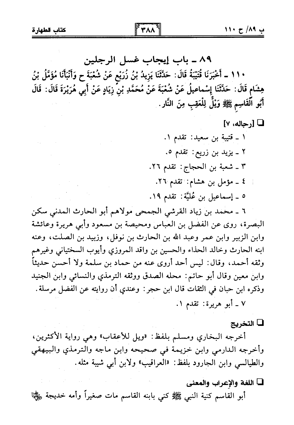 110 - أَخْبَرَنَا قُتَيْبَةُ قَالَ: حَدَّثَنَا يَزِيدُ بْنُ زُرَيْعٍ عَنْ شُعْبَةَ ح وَأَنْبَأَنَا مُؤَمَّلُ بْنُ هِشَامٍ قَالَ: حَدَّثَنَا إِسْمَاعِيلُ عَنْ شُعْبَةَ عَنْ مُحَمَّدِ بْنِ زِيَادٍ عَنْ أَبِي هُرَيْرَةَ قَالَ: قَالَ أَبُو الْقَاسِمِ - صلى الله عليه وسلم - وَيْلٌ لِلْعَقِبِ مِنَ النَّارِ.