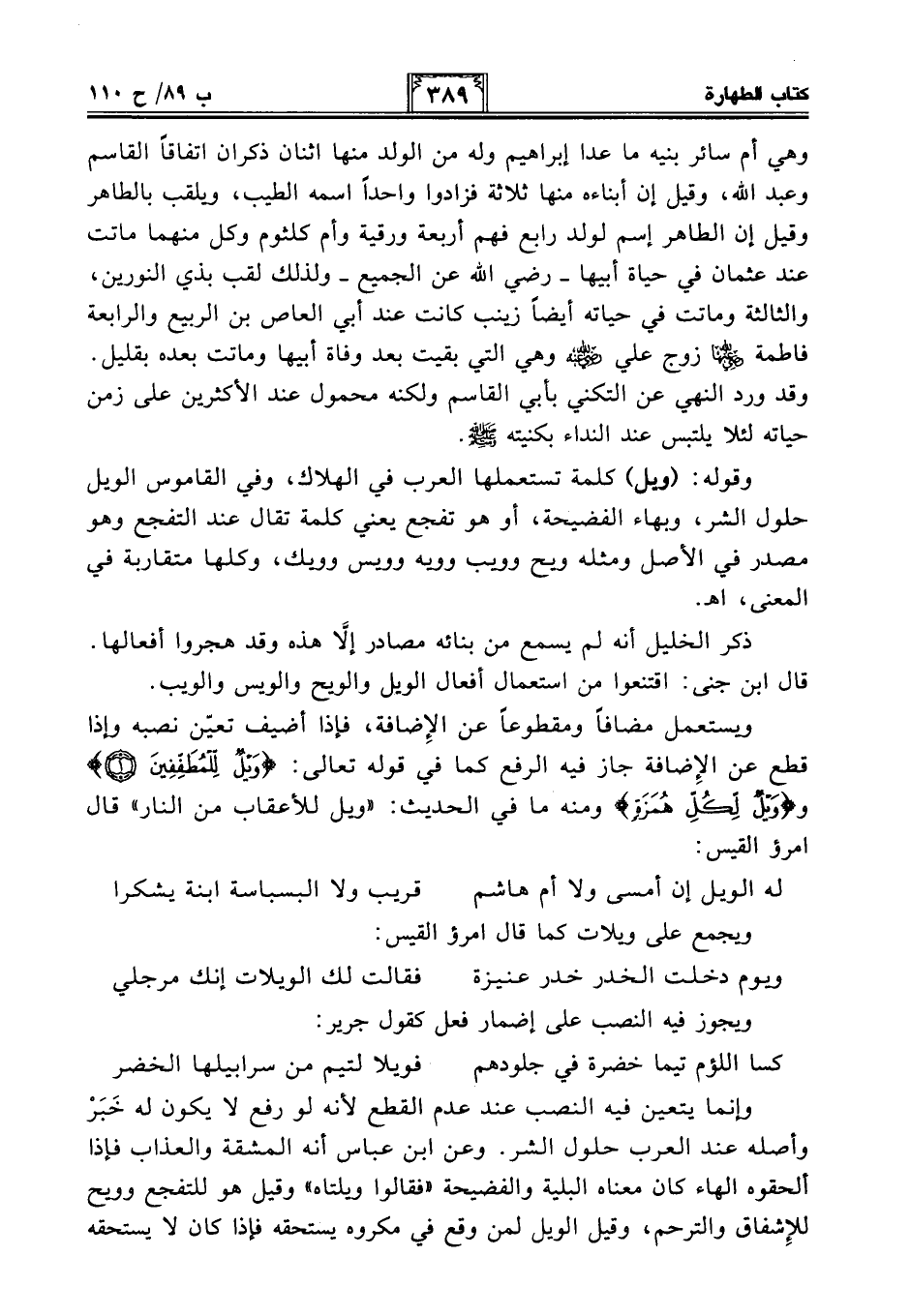 وقوله: (ويل) كلمة تستعملها العرب في الهلاك، وفي القاموس الويل حلول الشر، وبهاء الفصيحة، أو هو تفجع يعني كلمة تقال عند التفجع وهو مصدر في الأصل ومثله ويح وويب وويه وويس وويك، وكلها متقاربة في المعنى، اهـ.