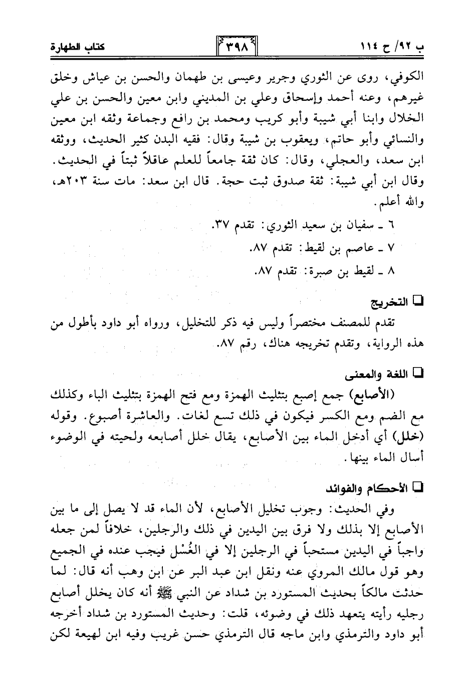 (الأصابع) جمع إصبع بتثليث الهمزة ومع فتح الهمزة بتثليث الباء وكذلك مع الضم ومع الكسر فيكون في ذلك تسع لغات. والعاشرة أصبوع. وقوله (خلل) أي أدخل الماء بين الأصابع، يقال خلل أصابعه ولحيته في الوضوء أسال الماء بينها.