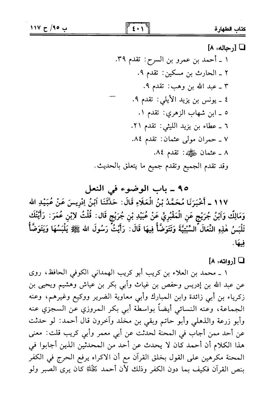 1 - محمَّد بن العلاء بن كريب أبو كريب الهمداني الكوفي الحافظ، روى عن عبد الله بن إدريس وحفص بن غياث وأبي بكر بن عياش وهشيم ويحيى بن زكرياء بن أبي زائدة وابن المبارك وأبي معاوية الضرير ووكيع وغيرهم، وعنه الجماعة، وعنه النسائي أيضًا بواسطة أبي بكر المروزي عن السجزي عنه وأبو زرعة والذهلي وأبو حاتم وبقي بن مخلد وآخرون قال أحمد: لو حدثت عن أحد ممن أجاب في المحنة لحدثت عن أبي معمر وأبي كريب قلت: معنى هذا الكلام أن أحمد كان لا يحدث عن أحد من المحدثين الذين أجابوا في المحنة مكرهين على القول بخلق القرآن مع أن الإكراه يرفع الحرج في الكفر بنص القرآن فكيف بما دون الكفر وذلك لأن أحمد -رحمه الله- الله كان يرى الصبر ولو