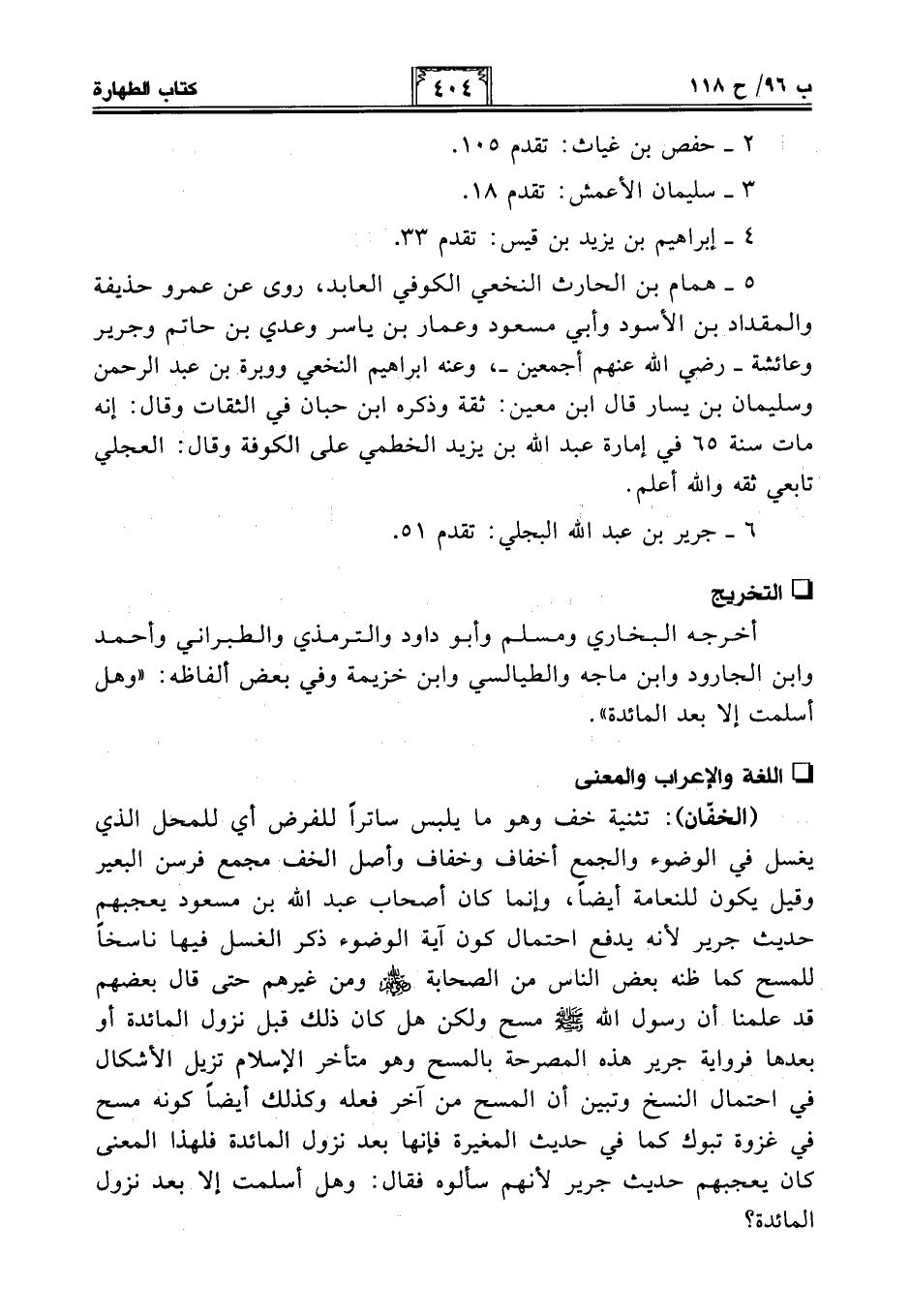 (الخفّان): تثنية خف وهو ما يلبس ساترًا للفرض أي للمحل الذي يغسل في الوضوء والجمع أخفاف وخفاف وأصل الخف مجمع فرسن البعير وقيل يكون للنعامة أيضًا، وإنما كان أصحاب عبد الله بن مسعود يعجبهم حديث جرير لأنه يدفع احتمال كون آية الوضوء ذكر الغسل فيها ناسخًا للمسح كما ظنه بعض الناس من الصحابة -رضي الله عنهم- ومن غيرهم حتى قال بعضهم قد علمنا أن رسول الله - صلى الله عليه وسلم - مسح ولكن هل كان ذلك قبل نزول المائدة أو بعدها فرواية جرير هذه المصرحة بالمسح وهو متأخر الإِسلام تزيل الإشكال في احتمال النسخ وتبين أن المسح من آخر فعله وكذلك أيضًا كونه مسح في غزوة تبوك كما في حديث المغيرة فإنها بعد نزول المائدة فلهذا المعنى كان يعجبهم حديث جرير لأنهم سألوه فقال: وهل أسلمت إلا بعد نزول المائدة؟