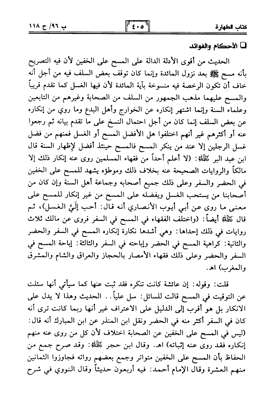 قلت: وقوله: إن عائشة كانت تنكره فقد ثبت عنها كما سيأتي أنها سئلت عن التوقيت في المسح قالت للسائل: سل عليًا .. الحديث وهذا لا يدل على الإنكار بل هو أقرب إلى الدليل على الاعتراف غير أنها ربما كانت ترى أنه كان في السفر أكثر منه في الحضر ونقل ابن المنذر عن ابن المبارك أنه قال: (ليس في المسح على الخفين عن الصحابة اختلاف لأن كل من روى عنه منهم إنكاره فقد روى عنه إثباته) اهـ. وقال ابن حجر -رحمه الله-: وقد صرح جمع من الحفاظ بأن المسح على الخفين متواتر وجمع بعضهم رواته فجاوزوا الثمانين منهم العشرة وقال الإِمام أحمد: فيه أربعون حديثًا وقال النووي في شرح