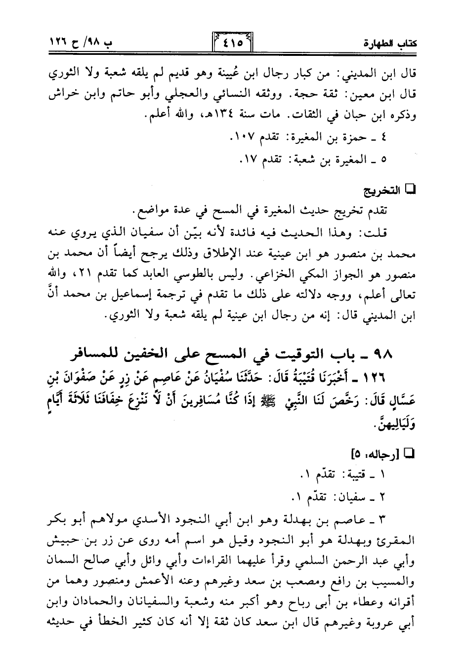 126 - أَخْبَرَنَا قُتَيْبَةُ قَالَ: حَدَّثَنَا سُفْيَانُ عَنْ عَاصِمٍ عَنْ زِرٍّ عَنْ صَفْوَانَ بْنِ عَسَّالٍ قَالَ: رَخَّصَ لَنَا النَّبِيُّ - صلى الله عليه وسلم - إِذَا كُنَّا مُسَافِرِينَ أَنْ لَا نَنْزِعَ خِفَافَنَا ثَلَاثَةَ أَيَّامٍ وَلَيَالِيَهنَّ.