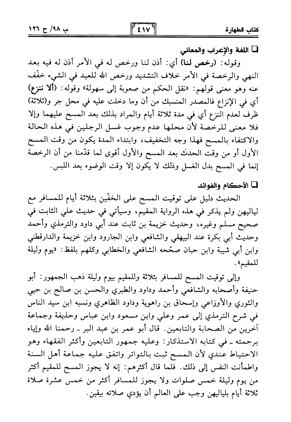 وإلى توقيت المسح للمسافر بثلاثة وللمقيم بيوم وليلة ذهب الجمهور: أبو حنيفة وأصحابه والشافعي وأحمد وداود والطبري والحسن بن صالح بن حيي والثوري والأوزاعي وإسحاق بن راهوية وداود الظاهري ونسبه ابن سيد الناس في شرح الترمذي إلى عمر وعلي وابن مسعود وابن عباس وحذيفة وجماعة آخرين من الصحابة والتابعين. قال أبو عمر بن عبد البر -رحمنا الله وإياه برحمته- في كتابه الاستذكار: وعليه جمهور التابعين وأكثر الفقهاء وهو الاحتياط عندي لأن المسح ثبت بالتواتر واتفق عليه جماعة أهل السنة واطمأنت النفس إلى ذلك. فلما قال أكثرهم: إنه لا يجوز المسح للمقيم أكثر من يوم وليلة خمس صلوات ولا يجوز للمسافر أكثر من خمس عشرة صلاة ثلاثة أيام بلياليهن وجب على العالم أن يؤدي صلاته بيقين.