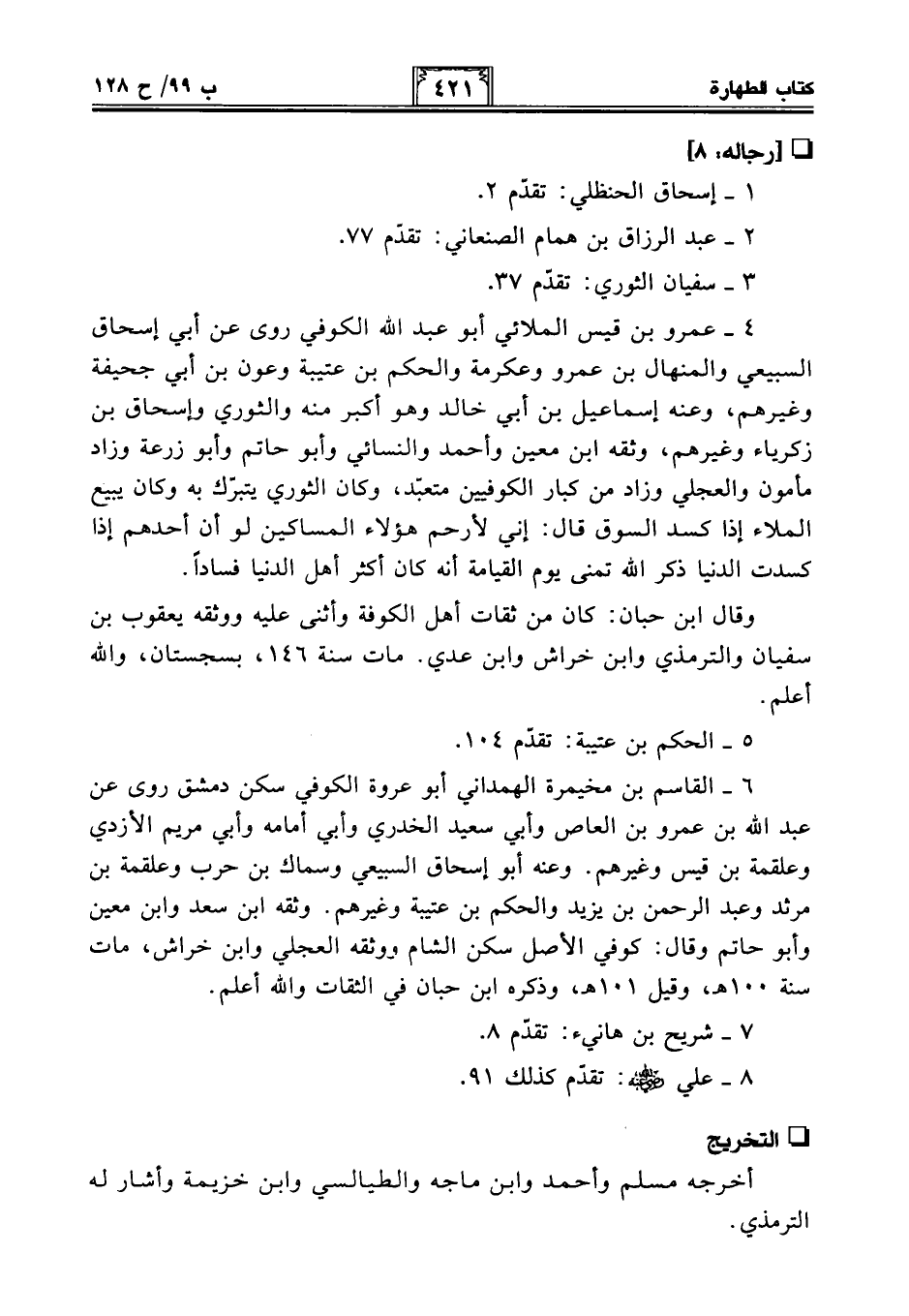 4 - عمرو بن قيس الملائي أبو عبد الله الكوفي روى عن أبي إسحاق السبيعي والمنهال بن عمرو وعكرمة والحكم بن عتيبة وعون بن أبي جحيفة وغيرهم، وعنه إسماعيل بن أبي خالد وهو أكبر منه والثوري وإسحاق بن زكرياء وغيرهم، وثقه ابن معين وأحمد والنسائي وأبو حاتم وأبو زرعة وزاد مأمون والعجلي وزاد من كبار الكوفيين متعبد، وكان الثوري يتبرك به وكان يبيع الملاء إذا كسد السوق قال: إني لأرحم هؤلاء المساكين لو أن أحدهم إذا كسدت الدنيا ذكر الله تمنى يوم القيامة أنه كان أكثر أهل الدنيا فسادًا.