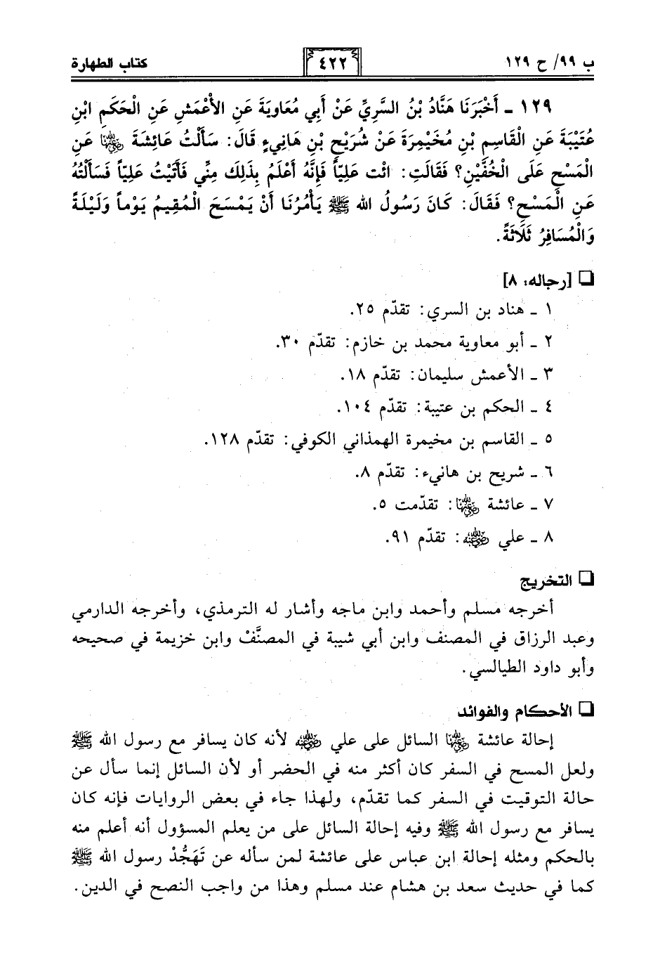 إحالة عائشة -رضي الله عنها- السائل على علي - رضي الله عنه - لأنه كان يسافر مع رسول - صلى الله عليه وسلم - ولعل المسح في السفر كان أكثر منه في الحضر أو لأن السائل إنما سأل عن حالة التوقيت في السفر كما تقدّم، ولهذا جاء في بعض الروايات فإنه كان يسافر مع رسول الله - صلى الله عليه وسلم - وفيه إحالة السائل على من يعلم المسؤول أنه أعلم منه بالحكم ومثله إحالة ابن عباس على عائشة لمن سأله عن تَهَجُّدْ رسول الله - صلى الله عليه وسلم - كما في حديث سعد بن هشام عند مسلم وهذا من واجب النصح في الدين.