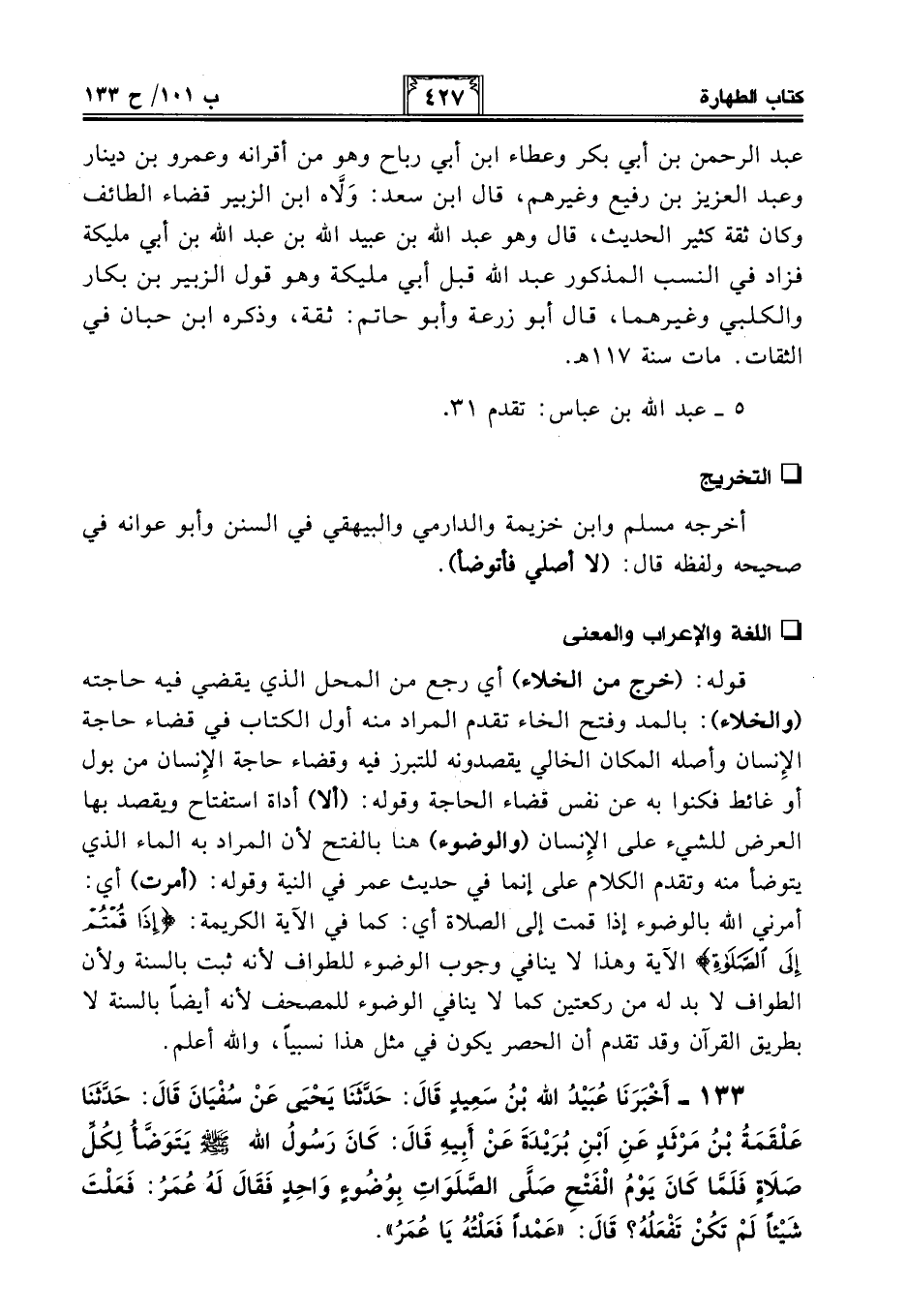 133 - أَخْبَرَنَا عُبَيْدُ اللَّهِ بْنُ سَعِيدٍ قَالَ: حَدَّثَنَا يَحْيَى عَنْ سُفْيَانَ قَالَ: حَدَّثَنَا عَلْقَمَةُ بْنُ مَرْثَدٍ عَنِ ابْنِ بُرَيْدَةَ عَنْ أَبِيهِ قَالَ: كَانَ رَسُولُ اللَّهِ - صلى الله عليه وسلم - يَتَوَضَّأُ لِكُلِّ صَلَاةٍ فَلَمَّا كَانَ يَوْمُ الْفَتْحِ صَلَّى الصَّلَوَاتِ بِوُضُوءٍ وَاحِدٍ فَقَالَ لَهُ عُمَرُ: فَعَلْتَ شَيْئًا لَمْ تَكُنْ تَفْعَلُهُ؟ قَالَ: "عَمْدًا فَعَلْتُهُ يَا عُمَرُ".