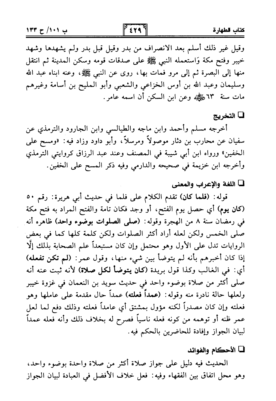 قوله: (فلما كان) تقدم الكلام على فلما في حديث أبي هريرة: رقم 50 (كان يوم) أي حصل يوم الفتح، أو وجد فكان تامة والفتح المراد به فتح مكة في رمضان سنة 8 من الهجرة وقوله: (صلى الصلوات بوضوء واحد) ظاهره أنه صلى الخمس ولكن لعله أراد أكثر الصلوات ولكن كلمة كلها كما في بعض الروايات تدل على الأول وهو محتمل وإن كان مستبعدًا علم الصحابة بذلك إلا إذا كان أخبرهم بأنه لم يتوضأ بين شيء منها، وقول عمر: (لم تكن تفعله) أي: في الغالب وكذا قول بريدة (كان يتوضأ لكل صلاة) لأنه ثبت عنه أنه صلى أكثر من صلاة بوضوء واحد في حديث سويد بن النعمان في غزوة خيبر ولعلها حالة نادرة منه وقوله: (عمدًا فعلته) عمدًا حال مقدمة على عاملها وهو فعلته وإن كان مصدرًا لكنه مؤول بمشتق أي عامدًا فعلته وذلك دفع لما لعل عمر ظنه أو توهمه من كونه فعله ناسيًا فصرح له بخلاف ذلك وأنه فعله عمدًا لبيان الجواز وإفادة للحاضرين بالحكم فيه.