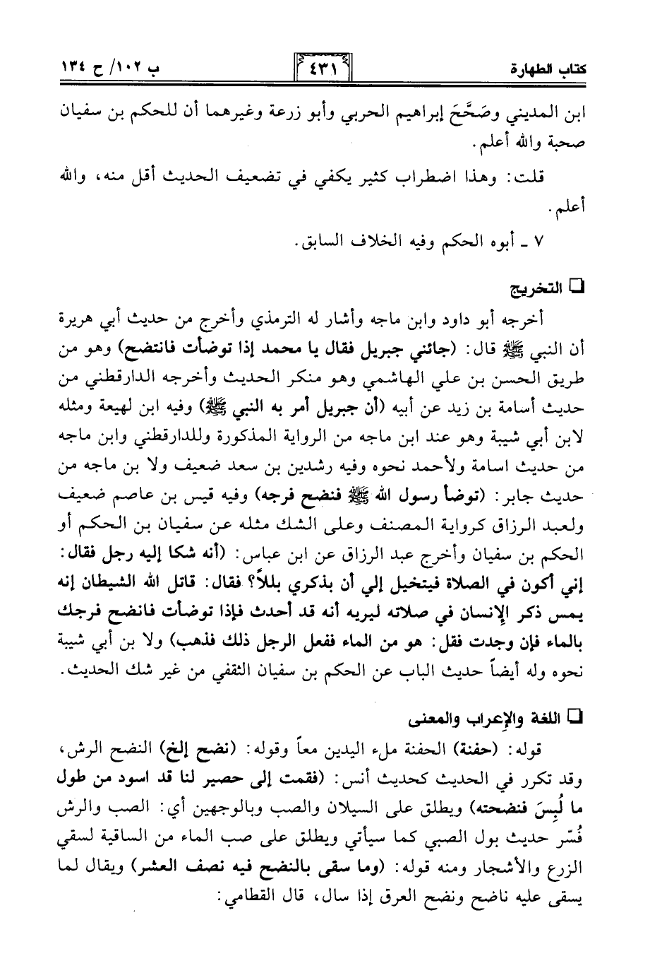 أخرجه أبو داود وابن ماجه وأشار له الترمذي وأخرج من حديث أبي هريرة أن النبي - صلى الله عليه وسلم - قال: (جائني جبريل فقال يا محمَّد إذا توضأت فانتضح) وهو من طريق الحسن بن علي الهاشمي وهو منكر الحديث وأخرجه الدارقطني من حديث أسامة بن زيد عن أبيه (أن جبريل أمر به النبي - صلى الله عليه وسلم -) وفيه ابن لهيعة ومثله لابن أبي شيبة وهو عند ابن ماجه من الرواية المذكورة وللدارقطني وابن ماجه من حديث أسامة ولأحمد نحوه وفيه رشدين بن سعد ضعيف ولابن ماجه من حديث جابر: (توضأ رسول الله - صلى الله عليه وسلم - فنضح فرجه) وفيه قيس بن عاصم ضعيف ولعبد الرزاق كرواية المصنف وعلى الشك مثله عن سفيان بن الحكم أو الحكم بن سفيان وأخرج عبد الرزاق عن ابن عباس: (أنه شكا إليه رجل فقال: إني أكون في الصلاة فيتخيل إلي أن بذكري بللًا؟ فقال: قاتل الله الشيطان إنه يمس ذكر الإنسان في صلاته ليريه أنه قد أحدث فإذا توضأت فانضح فرجك بالماء فإن وجدت فقل: هو من الماء ففعل الرجل ذلك فذهب) ولابن أبي شيبة نحوه وله أيضًا حديث الباب عن الحكم بن سفيان الثقفي من غير شك الحديث.