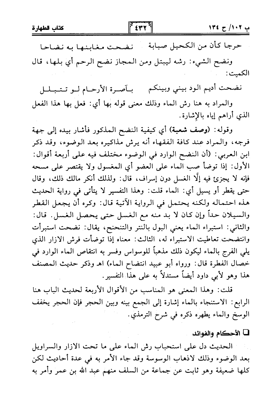 وقوله: (وصف شعبة) أي كيفية النضح المذكور فأشار بيده إلى جهة فرجه، والمراد عند كافة الفقهاء أنه يرش مذاكيره بعد الوضوء، وقد ذكر ابن العربي: (أن النضح الوارد في الوضوء مختلف فيه على أربعة أقوال: الأول: إذا توضأ صب الماء على العضو أي المغسول ولا يقتصر على مسحه فإنه لا يجزئ فيه إلَّا الغسل دون إسراف، قال: ولذلك أنكر مالك ذلك، وقال حتى يقطر أو يسيل أي: الماء قلت: وهذا التفسير لا يتأتى في رواية الحديث هذه احتماله ولكنه يحتمل في الرواية الآتية قال: وكره أن يجعل القطر والسيلان حدًا وإن كان لابد منه مع الغسل حتى يحصل الغسل. قال: والثاني: استبراء الماء يعني البول بالنتر والتنحنح، يقال: نضحت استبرأت وانتضحت تعاطيت الاستبراء له، الثالث: معناه إذا توضأت فرش الإزار الذي يلي الفرج بالماء ليكون ذلك مذهبًا للوسواس وفسر به انتقاص الماء الوارد في خصال الفطرة قال: ورواه أبو عبيد انتضاح الماء) اهـ وذكر حديث المصنف هذا وهو لأبي داود أيضًا مستدلًا به على هذا التفسير.