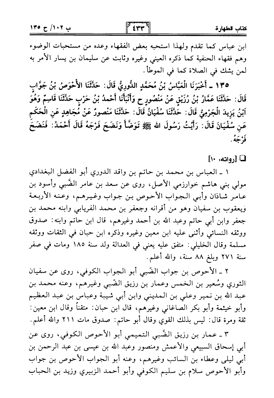 135 - أَخْبَرَنَا الْعَبَّاسُ بْنُ مُحَمَّدٍ الدُّورِيُّ قَالَ: حَدَّثَنَا الأَحْوَصُ بْنُ جَوَّابٍ قَالَ: حَدَّثَنَا عَمَّارُ بْنُ رُزَيْقٍ عَنْ مَنْصُورٍ ح وَأَنْبَأَنَا أَحْمَدُ بْنُ حَرْبٍ حَدَّثَنَا قَاسِمٌ وَهُوَ ابْنُ يَزِيدَ الْجَرْمِيُّ قَالَ: حَدَّثَنَا سُفْيَانُ قَالَ: حَدَّثَنَا مَنْصُورٌ عَنْ مُجَاهِدٍ عَنِ الْحَكَمِ عَنِ سُفْيَانَ قَالَ: رَأَيْتُ رَسُولَ اللَّهِ - صلى الله عليه وسلم - تَوَضَّأَ وَنَضَحَ فَرْجَهُ قَالَ أَحْمَدُ: فَنَضَحَ فَرْجَهُ.