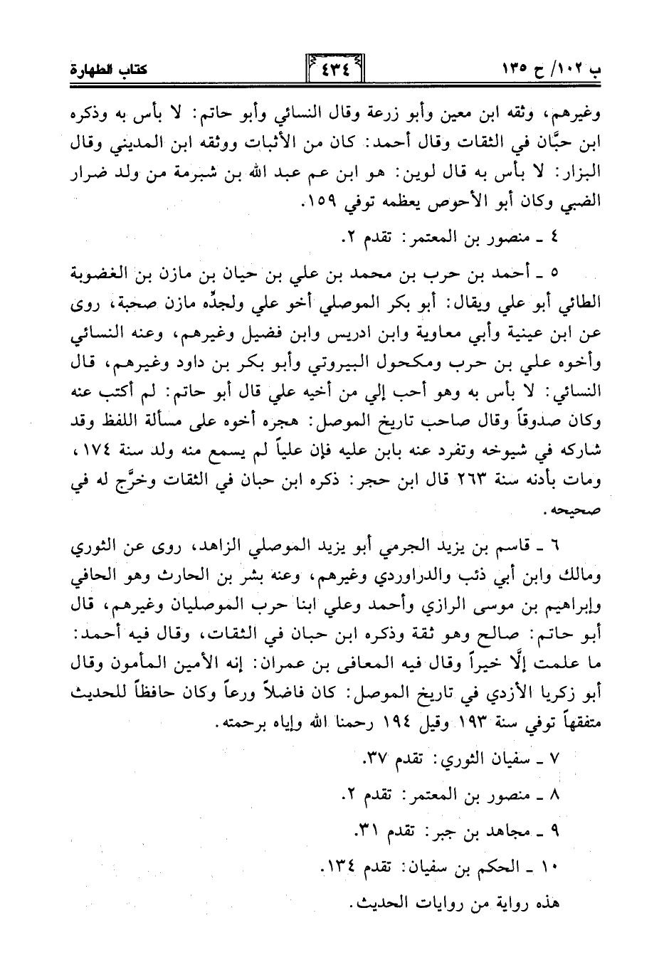 5 - أحمد بن حرب بن محمَّد بن علي بن حيان بن مازن بن الغضوبة الطائي أبو علي ويقال: أبو بكر الموصلي أخو علي ولجدِّه مازن صحبة، روى عن ابن عينية وأبي معاوية وابن إدريس وابن فضيل وغيرهم، وعنه النسائي وأخوه علي بن حرب ومكحول البيروتي وأبو بكر بن داود وغيرهم، قال النسائي: لا بأس به وهو أحب إلي من أخيه علي قال أبو حاتم: لم أكتب عنه وكان صدوقًا وقال صاحب تاريخ الموصل: هجره أخوه على مسألة اللفظ وقد شاركه في شيوخه وتفرد عنه بابن عليه فإن عليًا لم يسمع منه ولد سنة 174، ومات بأدنه سنة 263 قال ابن حجر: ذكره ابن حبان في الثقات وخرَّج له في صحيحه.