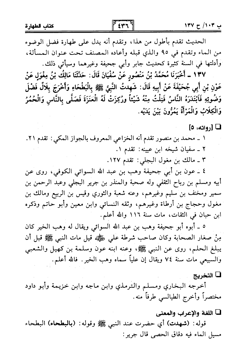 137 - أَخْبَرَنَا مُحَمَّدُ بْنُ مَنْصُورٍ عَنْ سُفْيَانَ قَالَ: حَدَّثَنَا مَالِكُ بْنُ مِغْوَلٍ عَنْ عَوْنِ بْنِ أَبِي جُحَيْفَةَ عَنْ أَبِيهِ قَالَ: شَهِدْتُ النَّبِيَّ - صلى الله عليه وسلم - بِالْبَطْحَاءِ وَأَخْرَجَ بِلَالٌ فَضْلَ وَضُوئِهِ فَابْتَدَرَهُ النَّاسُ فَنِلْتُ مِنْهُ شَيْئًا ورُكِزَتْ لَهُ الْعَنَزَةَ فَصَلَّى بِالنَّاسِ وَالْحُمُرُ وَالْكِلَابُ وَالْمَرْأَةُ يَمُرُّونَ بَيْنَ يَدَيْهِ.