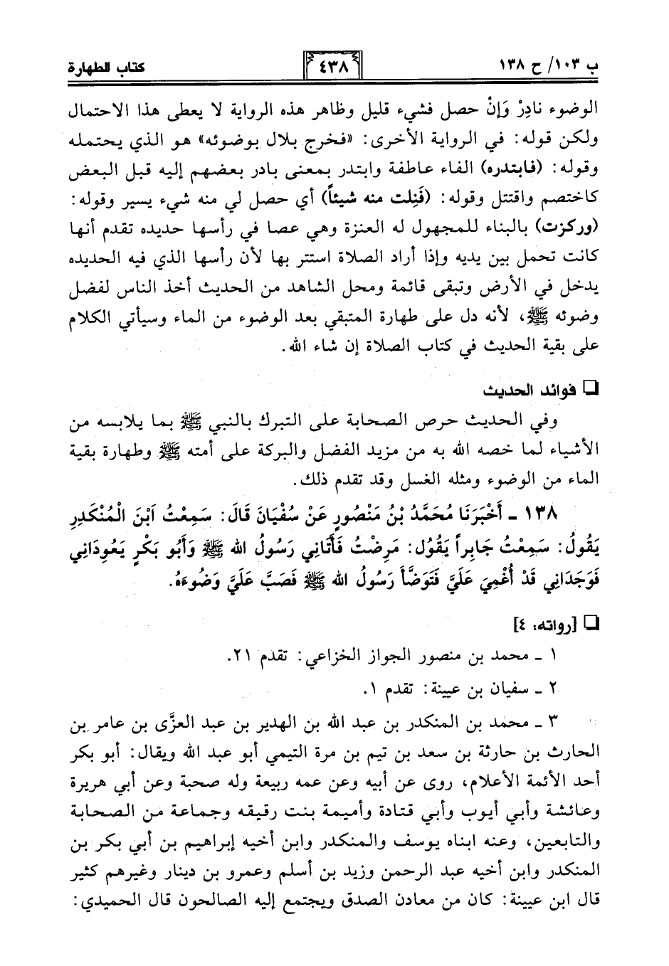 138 - أَخْبَرَنَا مُحَمَّدُ بْنُ مَنْصُورٍ عَنْ سُفْيَانَ قَالَ: سَمِعْتُ ابْنَ الْمُنْكَدِرِ يَقُولُ: سَمِعْتُ جَابِرًا يَقُولُ مَرِضْتُ فَأَتَانِي رَسُولُ اللَّهِ - صلى الله عليه وسلم - وَأَبُو بَكْرٍ يَعُودَانِّي فَوَجَدَانِي قَدْ أُغْمِيَ عَلَيَّ فَتَوَضَّأَ رَسُولُ اللَّهِ - صلى الله عليه وسلم - فَصَبَّ عَلَيَّ وَضُوءَهُ.
