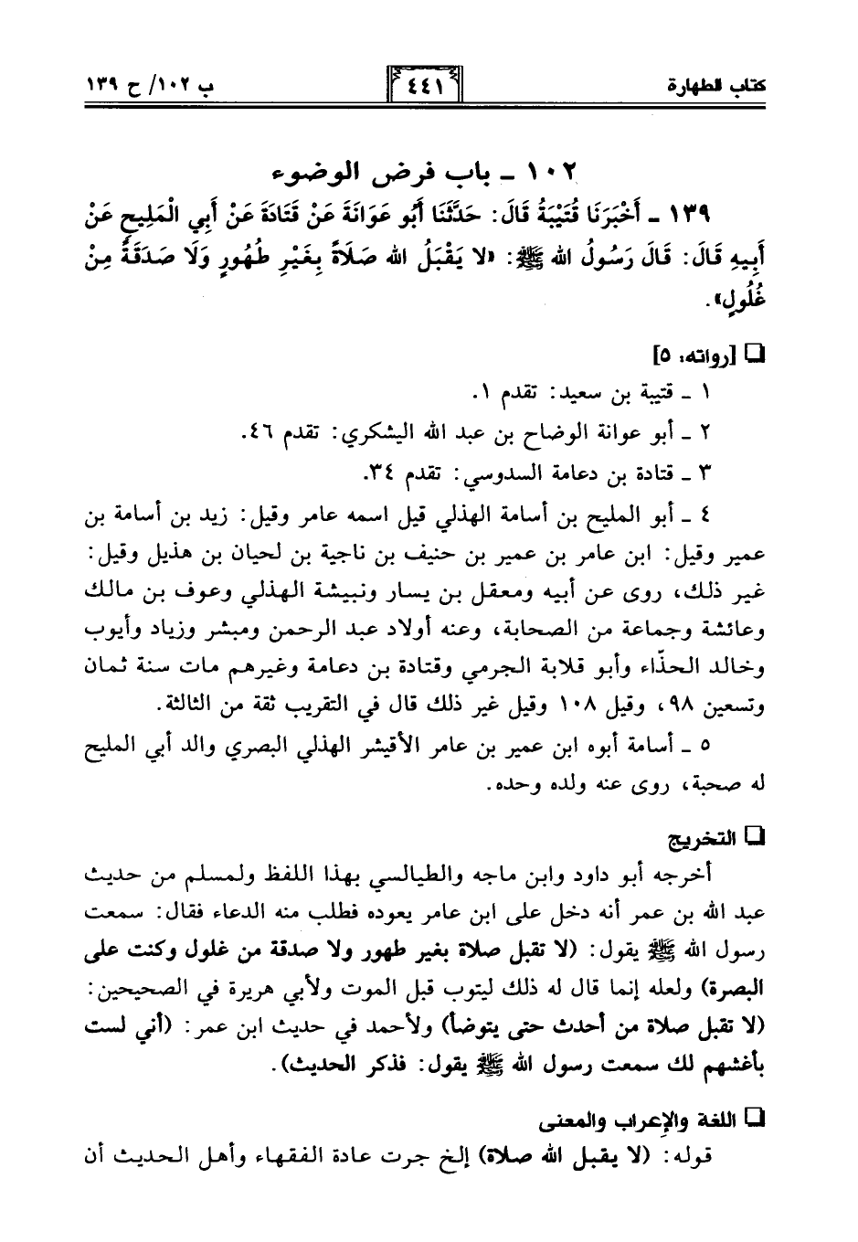 139 - أَخْبَرَنَا قُتَيْبَةُ قَالَ: حَدَّثَنَا أَبُو عَوَانَةَ عَنْ قَتَادَةَ عَنْ أَبِي الْمَلِيحِ عَنْ أَبِيهِ قَالَ: قَالَ رَسُولُ اللَّهِ - صلى الله عليه وسلم -: "لَا يَقْبَلُ اللَّهُ صَلَاةً بِغَيْرِ طُهُورٍ وَلَا صَدَقَةً مِنْ غُلُولٍ".