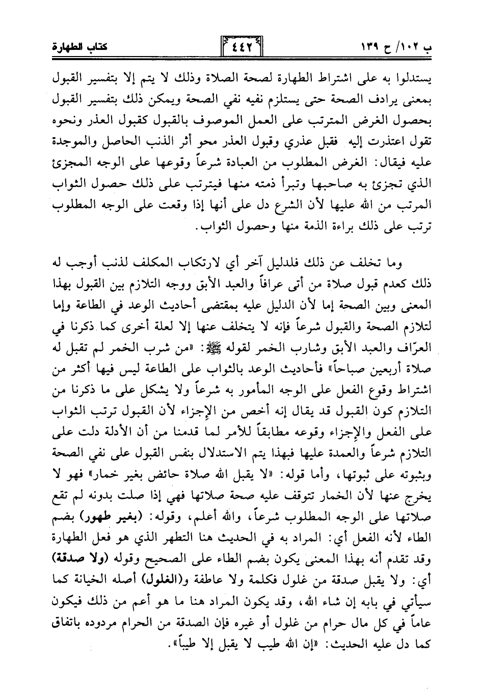 يستدلوا به على اشتراط الطهارة لصحة الصلاة وذلك لا يتم إلا بتفسير القبول بمعنى يرادف الصحة حتى يستلزم نفيه نفي الصحة ويمكن ذلك بتفسير القبول بحصول الغرض المترتب على العمل الموصوف بالقبول كقبول العذر ونحوه تقول اعتذرت إليه فقبل عذري وقبول العذر محو أثر الذنب الحاصل والموجدة عليه فيقال: الغرض المطلوب من العبادة شرعًا وقوعها على الوجه المجزئ الذي تجزئ به صاحبها وتبرأ ذمته منها فيترتب على ذلك حصول الثواب المرتب من الله عليها لأن الشرع دل على أنها إذا وقعت على الوجه المطلوب ترتب على ذلك براءة الذمة منها وحصول الثواب.