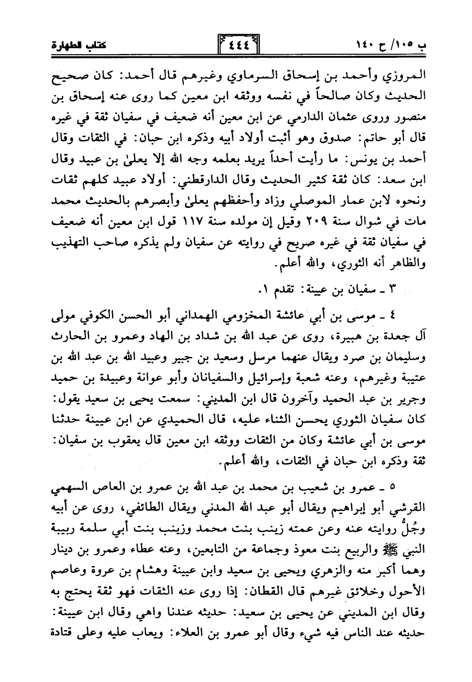 4 - موسى بن أبي عائشة المخزومي الهمداني أبو الحسن الكوفي مولى آل جعدة بن هبيرة، روى عن عبد الله بن شداد بن الهاد وعمرو بن الحارث وسليمان بن صرد ويقال عنهما مرسل وسعيد بن جبير وعبيد الله بن عبد الله بن عتيبة وغيرهم، وعنه شعبة وإسرائيل والسفيانان وأبو عوانة وعبيدة بن حميد وجرير بن عبد الحميد وآخرون قال ابن المديني: سمعت يحيى بن سعيد يقول: كان سفيان الثوري يحسن الثناء عليه، قال الحميدي عن ابن عيينة حدثنا موسى بن أبي عائشة وكان من الثقات ووثقه ابن معين قال يعقوب بن سفيان: ثقة وذكره ابن حبان في الثقات، والله أعلم.