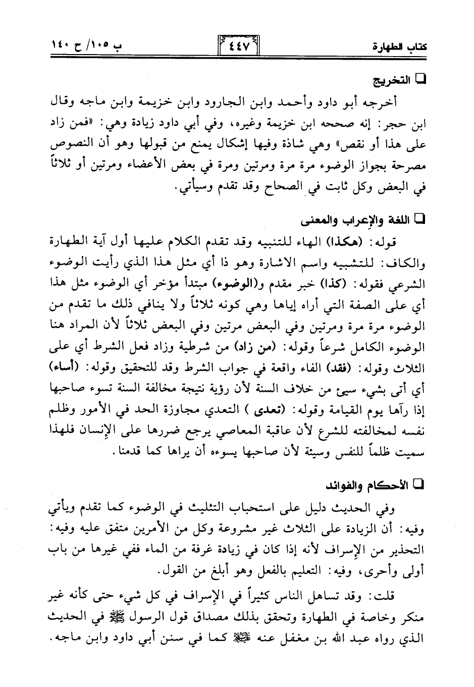 قوله: (هكذا) الهاء للتنبيه وقد تقدم الكلام عليها أول آية الطهارة والكاف: للتشبيه واسم الإشارة وهو ذا أي مثل هذا الذي رأيت الوضوء الشرعي فقوله: (كذا) خبر مقدم و (الوضوء) مبتدأ مؤخر أي الوضوء مثل هذا أي على الصفة التي أراه إياها وهي كونه ثلاثًا ولا ينافي ذلك ما تقدم من الوضوء مرة مرة ومرتين وفي البعض مرتين وفي البعض ثلاثًا لأن المراد هنا الوضوء الكامل شرعًا وقوله: (من زاد) من شرطية وزاد فعل الشرط أي على الثلاث وقوله: (فقد) الفاء واقعة في جواب الشرط وقد للتحقيق وقوله: (أساء) أي أتى بشيء سيئ من خلاف السنة لأن رؤية نتيجة مخالفة السنة تسوء صاحبها إذا رآها يوم القيامة وقوله: (تعدى) التعدي مجاوزة الحد في الأمور وظلم نفسه لمخالفته للشرع لأن عاقبة المعاصي يرجع ضررها على الإِنسان فلهذا سميت ظلمًا للنفس وسيئة لأن صاحبها يسوءه أن يراها كما قدمنا.