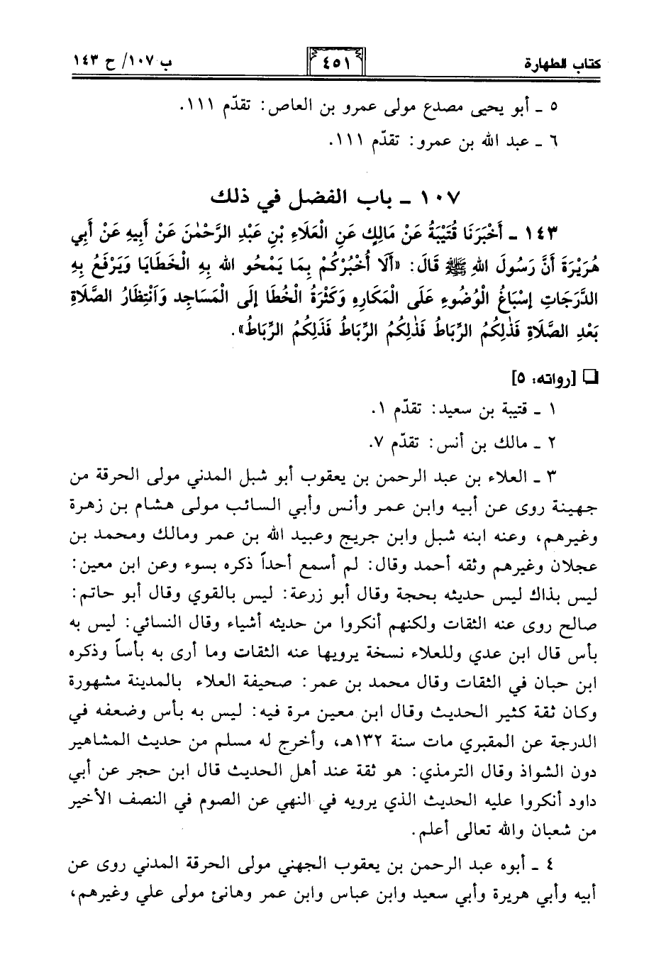 3 - العلاء بن عبد الرحمن بن يعقوب أبو شبل المدني مولى الحرقة من جهينة روى عن أبيه وابن عمر وأنس وأبي السائب مولى هشام بن زهرة وغيرهم، وعنه ابنه شبل وابن جريج وعبيد الله بن عمر ومالك ومحمد بن عجلان وغيرهم وثقه أحمد وقال: لم أسمع أحدًا ذكره بسوء وعن ابن معين: ليس بذاك ليس حديثه بحجة وقال أبو زرعة: ليس بالقوي وقال أبو حاتم: صالح روى عنه الثقات ولكنهم أنكروا من حديثه أشياء وقال النسائي: ليس به بأس قال ابن عدي وللعلاء نسخة يرويها عنه الثقات وما أرى به بأسًا وذكره ابن حبان في الثقات وقال محمد بن عمر: صحيفة العلاء بالمدينة مشهورة وكان ثقة كثير الحديث وقال ابن معين مرة فيه: ليس به بأس وضعفه في الدرجة عن المقبري مات سنة 132 هـ، وأخرج له مسلم من حديث المشاهير دون الشواذ وقال الترمذي: هو ثقة عند أهل الحديث قال ابن حجر عن أبي داود أنكروا عليه الحديث الذي يرويه في النهي عن الصوم في النصف الأخير من شعبان والله تعالى أعلم.
