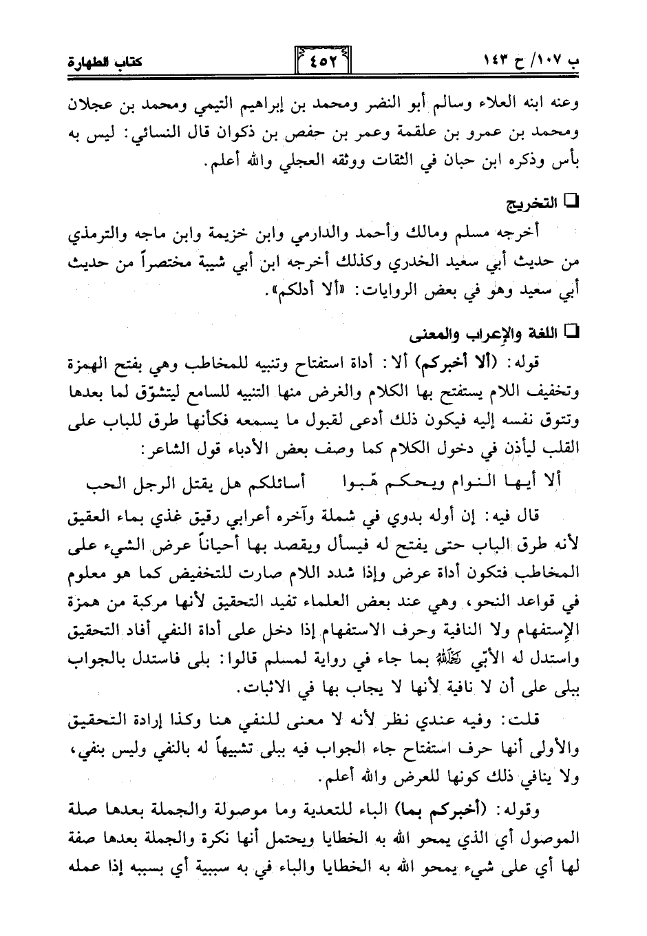 قال فيه: إن أوله بدوي في شملة وآخره أعرابي رقيق غذي بماء العقيق لأنه طرق الباب حتى يفتح له فيسأل ويقصد بها أحيانًا عرض الشيء على المخاطب فتكون أداة عرض وإذا شدد اللام صارت للتخفيض كما هو معلوم في قواعد النحو، وهي عند بعض العلماء تفيد التحقيق لأنها مركبة من همزة الإِستفهام ولا النافية وحرف الاستفهام إذا دخل على أداة النفي أفاد التحقيق واستدل له الأبي -رحمه الله- بما جاء في رواية لمسلم قالوا: بلى فاستدل بالجواب ببلى على أن لا نافية لأنها لا يجاب بها في الإثبات.