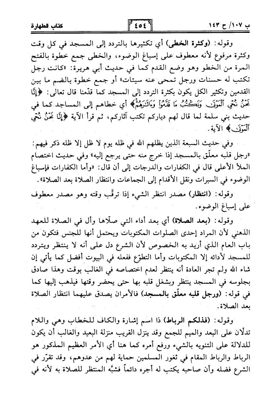 وفي حديث السبعة الذين يظلهم الله في ظله يوم لا ظل إلا ظله ذكر فيهم: "رجل قلبه معلّق بالمسجد إذا خرج منه حتى يرجع إليه" وفي حديث اختصام الملأ الأعلى قال في الكفارات والدرجات إلى أن قال: "وأما الكفارات فإسباغ الوضوء في السبرات ونقل الأقدام إلى الجماعات وانتظار الصلاة بعد الصلاة".