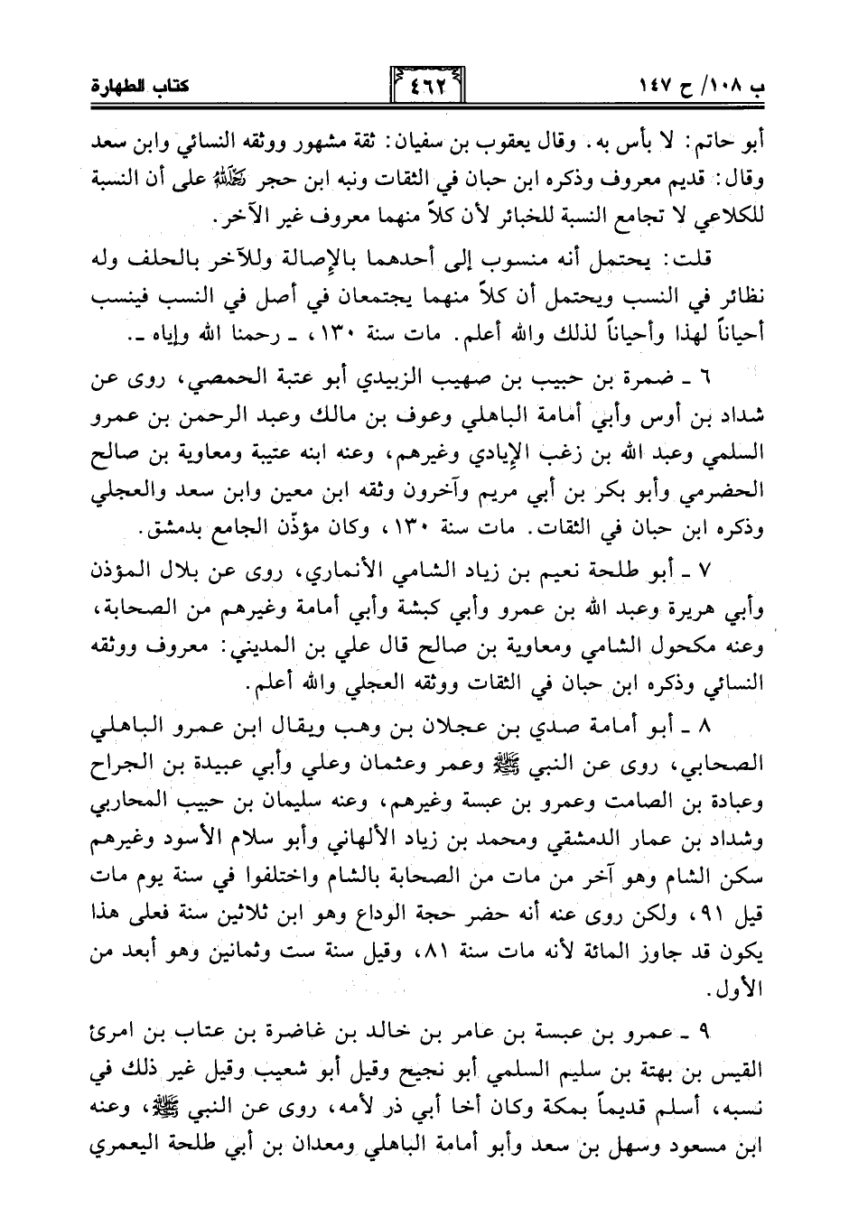 6 - ضمرة بن حبيب بن صهيب الزبيدي أبو عتبة الحمصي، روى عن شداد بن أوس وأبي أمامة الباهلي وعوف بن مالك وعبد الرحمن بن عمرو السلمي وعبد الله بن زغب الإِيادي وغيرهم، وعنه ابنه عتيبة ومعاوية بن صالح الحضرمي وأبو بكر بن أبي مريم وآخرون وثقه ابن معين وابن سعد والعجلي وذكره ابن حبان في الثقات. مات سنة 130، وكان مؤذّن الجامع بدمشق.