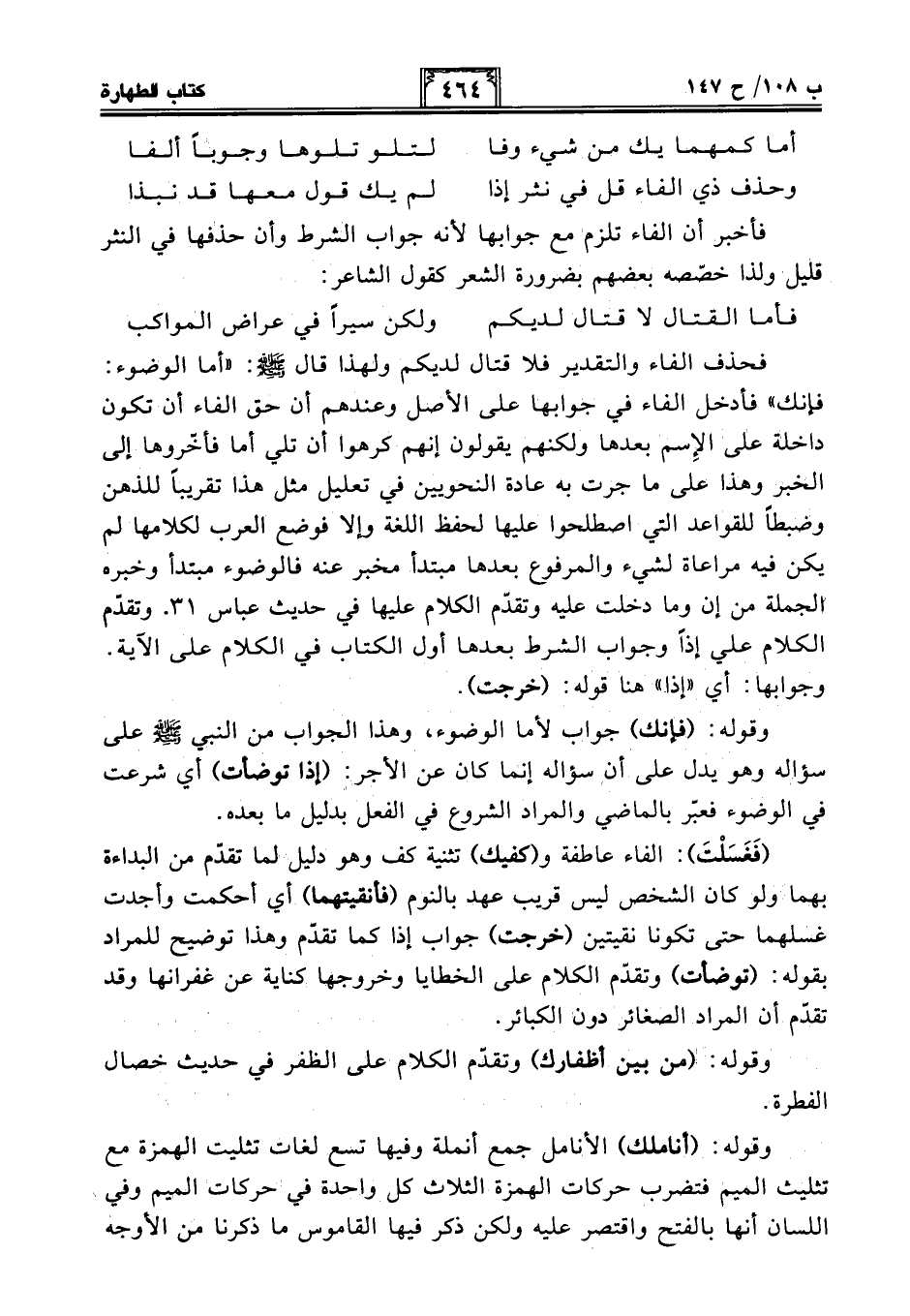 فحذف الفاء والتقدير فلا قتال لديكم ولهذا قال - صلى الله عليه وسلم -: "أما الوضوء: فإنك" فأدخل الفاء في جوابها على الأصل وعندهم أن حق الفاء أن تكون داخلة على الإِسم بعدها ولكنهم يقولون إنهم كرهوا أن تلي أما فأخّروها إلى الخبر وهذا على ما جرت به عادة النحويين في تعليل مثل هذا تقريبًا للذهن وضبطًا للقواعد التي اصطلحوا عليها لحفظ اللغة وإلا فوضع العرب لكلامها لم يكن فيه مراعاة لشيء والمرفوع بعدها مبتدأ مخبر عنه فالوضوء مبتدأ وخبره الجملة من إن وما دخلت عليه وتقدّم الكلام عليها في حديث عباس 31. وتقدّم الكلام علي إذًا وجواب الشرط بعدها أول الكتاب في الكلام على الآية. وجوابها: أي "إذا" هنا قوله: (خرجت).