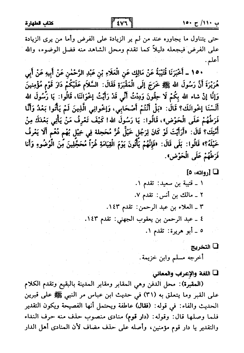 150 - أَخْبَرَنَا قُتَيْبَةُ عَنْ مَالِكٍ عَنِ الْعَلَاءِ بْنِ عَبْدِ الرَّحْمَنِ عَنْ أَبِيهِ عَنْ أَبِي هُرَيْرَةَ أَنَّ رَسُولَ اللَّهِ - صلى الله عليه وسلم - خَرَجَ إِلَى الْمَقْبُرَةِ فَقَالَ: السَّلَامُ عَلَيْكُمْ دَارَ قَوْمٍ مُؤْمِنِينَ وَإِنَّا إِنْ شَاءَ اللَّهُ بِكُمْ لَاحِقُونَ وَدِدْتُ أَنِّي قَدْ رَأَيْتُ إِخْوَانَنَا، قَالُوا: يَا رَسُولَ اللَّهِ أَلَسْنَا إِخْوَانَكَ؟ قَالَ: "بَلْ أَنْتُمْ أَصْحَابِي، وَإِخْوَانِي الَّذِينَ لَمْ يَأْتُوا بَعْدُ وَأَنَا فَرَطُهُمْ عَلَى الْحَوْضِ"، قَالُوا: يَا رَسُولَ اللَّهِ! كَيْفَ تَعْرِفُ مَنْ يَأْتِي بَعْدَكَ مِنْ أُمَّتِكَ قَالَ: "أَرَأَيْتَ لَوْ كَانَ لِرَجُلٍ خَيْلٌ غُرٌّ مُحَجَّلَةٌ فِي خَيْلٍ بُهْمٍ دُهْمٍ أَلَا يَعْرِفُ خَيْلَهُ؟ ". قَالُوا: بَلَى قَالَ: "فَإِنَّهُمْ يَأْتُونَ يَوْمَ الْقِيَامَةِ غُرًّا مُحَجَّلِينَ مِنَ الْوُضُوءِ وَأَنَا فَرَطُهُمْ عَلَى الْحَوْضِ".