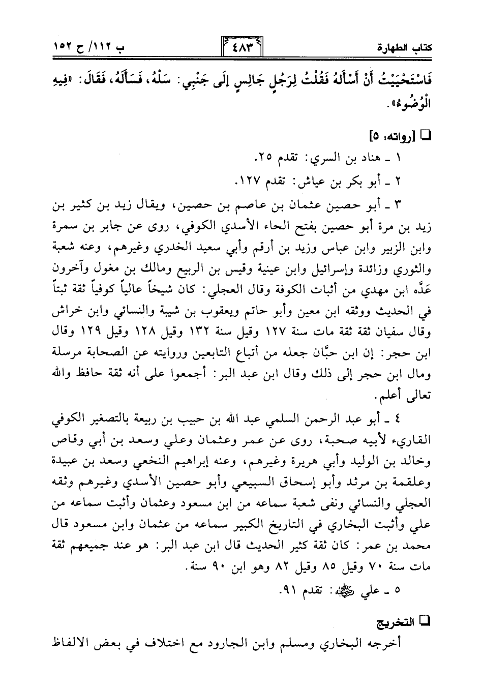 3 - أبو حصين عثمان بن عاصم بن حصين، ويقال زيد بن كثير بن زيد بن مرة أبو حصين بفتح الحاء الأسدي الكوفي، روى عن جابر بن سمرة وابن الزبير وابن عباس وزيد بن أرقم وأبي سعيد الخدري وغيرهم، وعنه شعبة والثوري وزائدة وإسرائيل وابن عينية وقيس بن الربيع ومالك بن مغول وآخرون عَدَّه ابن مهدي من أثبات الكوفة وقال العجلي: كان شيخًا عاليًا كوفيًا ثقة ثبتًا في الحديث ووثقه ابن معين وأبو حاتم ويعقوب بن شيبة والنسائي وابن خراش وقال سفيان ثقة ثقة مات سنة 127 وقيل سنة 132 وقيل 128 وقيل 129 وقال ابن حجر: إن ابن حبَّان جعله من أتباع التابعين وروايته عن الصحابة مرسلة ومال ابن حجر إلى ذلك وقال ابن عبد البر: أجمعوا على أنه ثقة حافظ والله تعالى أعلم.