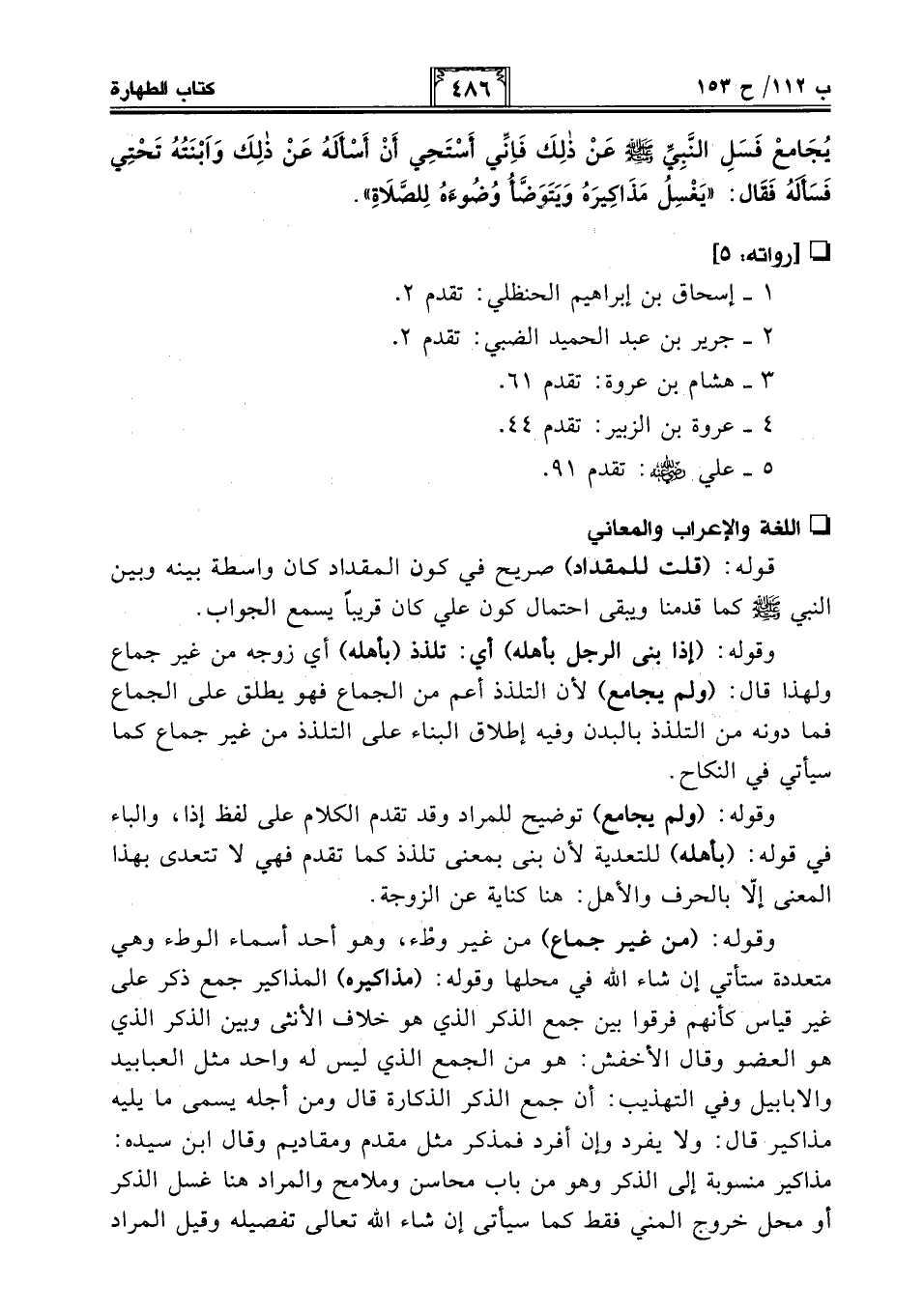 قوله: (قلت للمقداد) صريح في كون المقداد كان واسطة بينه وبين النبي - صلى الله عليه وسلم - كما قدمنا ويبقى احتمال كون علي كان قريبًا يسمع الجواب.