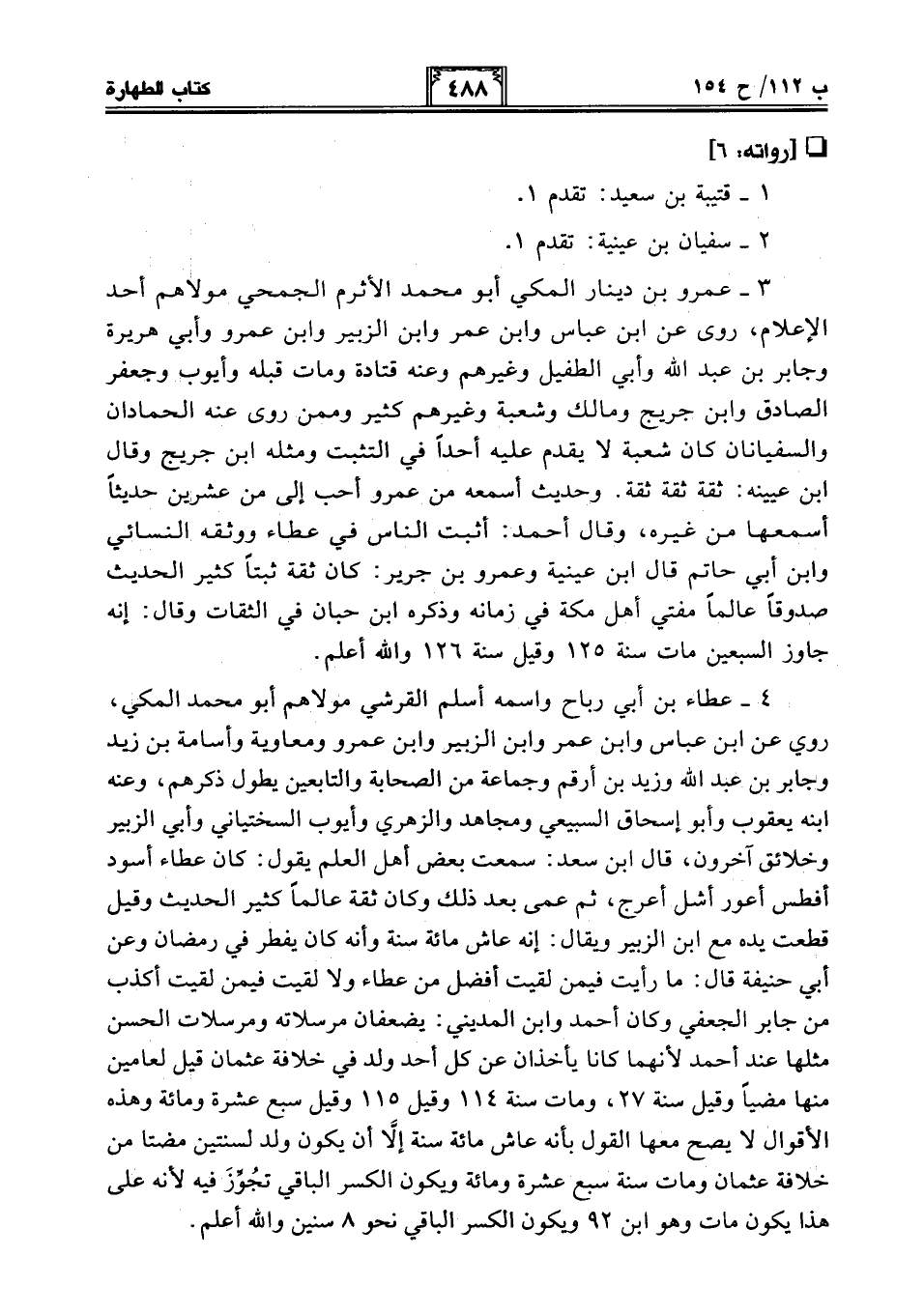 3 - عمرو بن دينار المكي أبو محمد الأثرم الجمحي مولاهم أحد الإعلام، روى عن ابن عباس وابن عمر وابن الزبير وابن عمرو وأبي هريرة وجابر بن عبد الله وأبي الطفيل وغيرهم وعنه قتادة ومات قبله وأيوب وجعفر الصادق وابن جريج ومالك وشعبة وغيرهم كثير وممن روى عنه الحمادان والسفيانان كان شعبة لا يقدم عليه أحدًا في التثبت ومثله ابن جريج وقال ابن عيينة: ثقة ثقة ثقة. وحديث أسمعه من عمرو أحب إلي من عشرين حديثًا أسمعها من غيره، وقال أحمد: أثبت الناس في عطاء ووثقه النسائي وابن أبي حاتم قال ابن عينية وعمرو بن جرير: كان ثقة ثبتًا كثير الحديث صدوقًا عالمًا مفتي أهل مكة في زمانه وذكره ابن حبان في الثقات وقال: إنه جاوز السبعين مات سنة 125 وقيل سنة 126 والله أعلم.