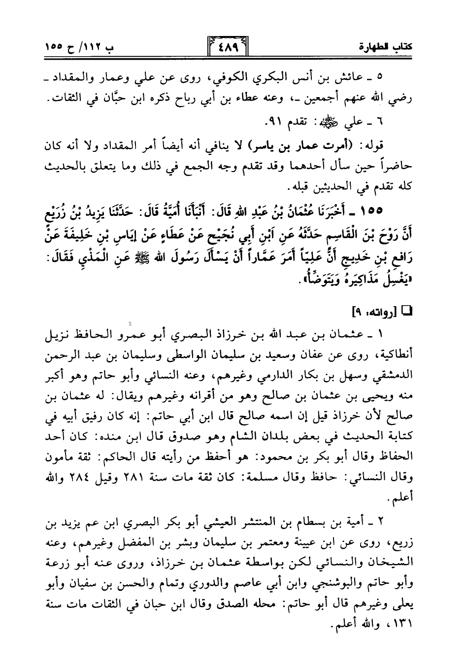 1 - عثمان بن عبد الله بن خرزاذ البصري أبو عمرو الحافظ نزيل أنطاكية، روى عن عفان وسعيد بن سليمان الواسطى وسليمان بن عبد الرحمن الدمشقي وسهل بن بكار الدارمي وغيرهم، وعنه النسائي وأبو حاتم وهو أكبر منه ويحيى بن عثمان بن صالح وهو من أقرانه وغيرهم ويقال: له عثمان بن صالح لأن خرزاذ قيل إن اسمه صالح قال ابن أبي حاتم: إنه كان رفيق أبيه في كتابة الحديث في بعض بلدان الشام وهو صدوق قال ابن منده: كان أحد الحفاظ وقال أبو بكر بن محمود: هو أحفظ من رأيته قال الحاكم: ثقة مأمون وقال النسائي: حافظ وقال مسلمة: كان ثقة مات سنة 281 وقيل 284 والله أعلم.