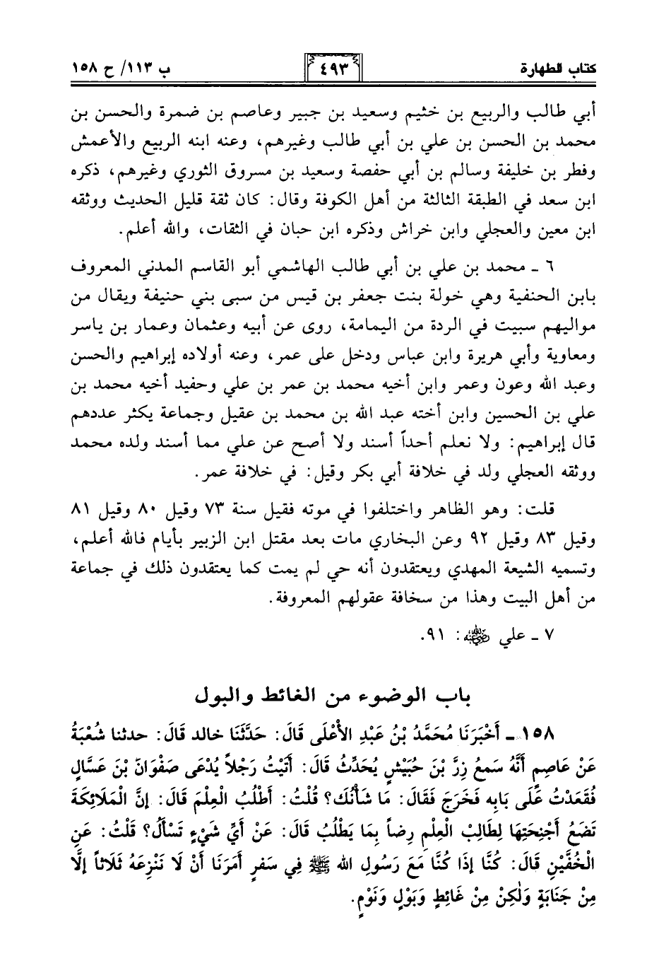 6 - محمد بن علي بن أبي طالب الهاشمي أبو القاسم المدني المعروف بابن الحنفية وهي خولة بنت جعفر بن قيس من سبي بني حنيفة ويقال من مواليهم سبيت في الردة من اليمامة، روى عن أبيه وعثمان وعمار بن ياسر ومعاوية وأبي هريرة وابن عباس ودخل على عمر، وعنه أولاده إبراهيم والحسن وعبد الله وعون وعمر وابن أخيه محمد بن عمر بن علي وحفيد أخيه محمد بن علي بن الحسين وابن أخته عبد الله بن محمد بن عقيل وجماعة يكثر عددهم قال إبراهيم: ولا نعلم أحدًا أسند ولا أصح عن علي مما أسند ولده محمد ووثقه العجلي ولد في خلافة أبي بكر وقيل: في خلافة عمر.
