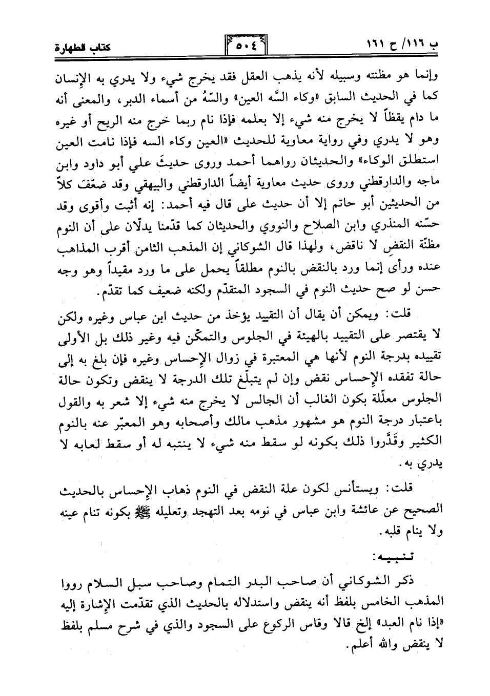وإنما هو مظنته وسبيله لأنه يذهب العقل فقد يخرج شيء ولا يدري به الإِنسان كما في الحديث السابق "وكاء السَّه العين" والسّهُ من أسماء الدبر، والمعنى أنه مادام يقظًا لا يخرج منه شيء إلا بعلمه فإذا نام ربما خرج منه الريح أو غيره وهو لا يدري وفي رواية معاوية للحديث "العين وكاء السه فإذا نامت العين استطلق الوكاء" والحديثان رواهما أحمد وروى حديثَ علي أبو داود وابن ماجه والدارقطني وروى حديث معاوية أيضًا الدارقطني والبيهقي وقد ضعّفَ كلا من الحديثين أبو حاتم إلا أن حديث علي قال فيه أحمد: إنه أثبت وأقوى وقد حسّنه المنذري وابن الصلاح والنووي والحديثان كما قدّمنا يدلان على أن النوم مظنة النقضِ لا ناقض، ولهذا قال الشوكاني إن المذهب الثامن أقرب المذاهب عنده ورأى إنما ورد بالنقض بالنوم مطلقًا يحمل على ما ورد مقيدًا وهو وجه حسن لو صح حديث النوم في السجود المتقدّم ولكنه ضعيف كما تقدّم.
