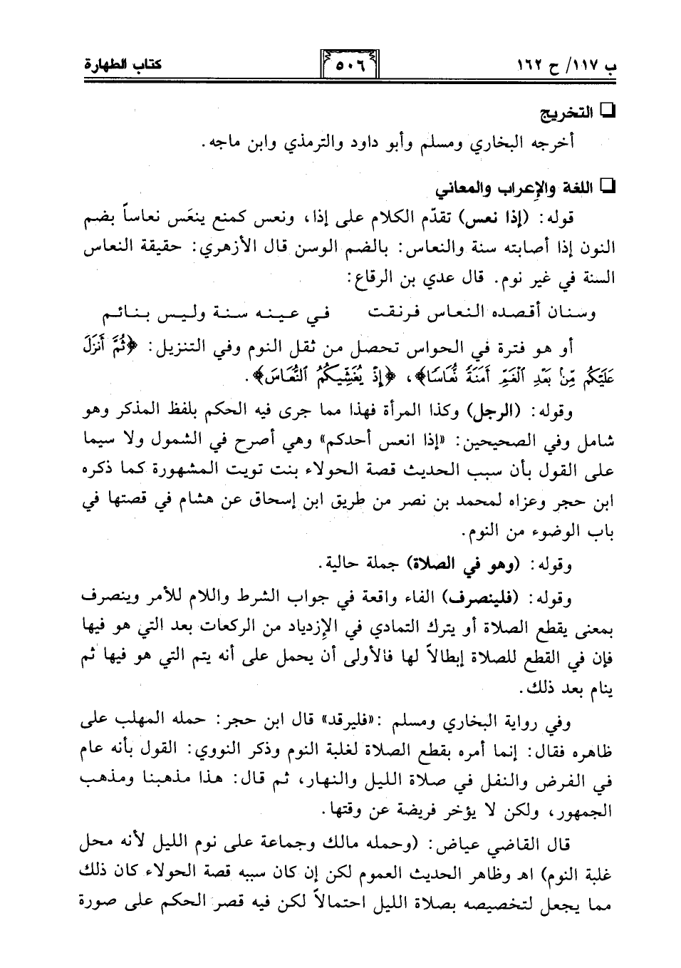 قال القاضي عياض: (وحمله مالك وجماعة على نوم الليل لأنه محل غلبة النوم) اهـ وظاهر الحديث العموم لكن إن كان سببه قصة الحولاء كان ذلك مما يجعل لتخصيصه بصلاة الليل احتمالًا لكن فيه قصر الحكم على صورة