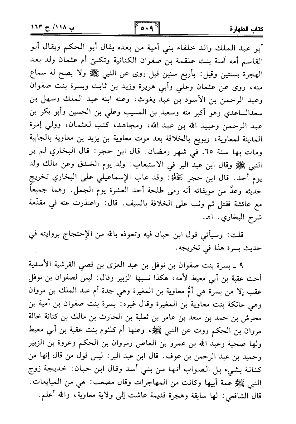 9 - بسرة بنت صفوان بن نوفل بن عبد العزى بن قصي القرشية الأسدية أخت عقبة بن أبي معيط لأمه، هكذا نسبها الزبير وقال: ليس لصفوان بن نوفل عقب إلا من بسرة هي أمُّ معاوية بن المغيرة وهي جدة أم عبد الملك بن مروان وهي عاتكة بنت معاوية بن المغيرة وقال غيره: بسرة بنت صفوان بن أمية بن محرش بن حمد بن سعد بن عامر بن ثعلبة بن الحارث بن مالك بن كنانة خالة مروان بن الحكم روت عن النبي - صلى الله عليه وسلم -، وعنها أم كلثوم بنت عقبة بن أبي معيط ولها صحبة وعبد الله بن عمرو بن العاص ومروان بن الحكم وعروة بن الزبير وحميد بن عبد الرحمن بن عوف. قال ابن عبد البر: ليس قول من قال إنها من كنانة بشيء بل الصواب أنها من بني أسد وقال ابن حبان: خديجة زوج النبي - صلى الله عليه وسلم - عمة أبيها وكانت من المهاجرات وقال مصعب: هي من المبايعات. قال الشافعي: لها سابقة وهجرة قديمة عاشت إلى ولاية معاوية، والله أعلم.