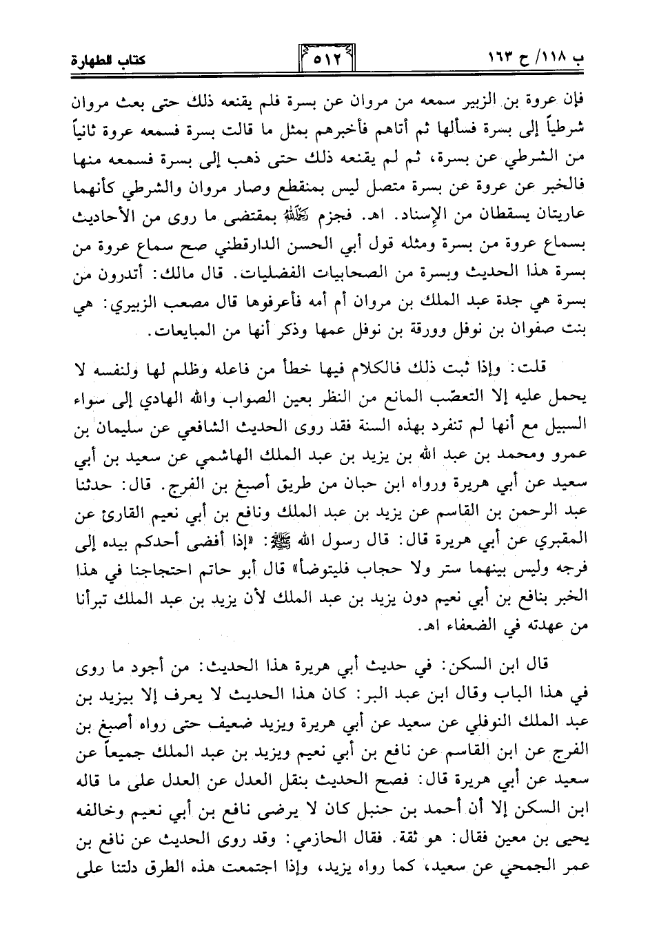 قلت: وإذا ثبت ذلك فالكلام فيها خطأ من فاعله وظلم لها ولنفسه لا يحمل عليه إلا التعصب المانع من النظر بعين الصواب والله الهادي إلى سواء السبيل مع أنها لم تنفرد بهذه السنة فقد روى الحديث الشافعي عن سليمان بن عمرو ومحمد بن عبد الله بن يزيد بن عبد الملك الهاشمي عن سعيد بن أبي سعيد عن أبي هريرة ورواه ابن حبان من طريق أصبغ بن الفرج. قال: حدثنا عبد الرحمن بن القاسم عن يزيد بن عبد الملك ونافع بن أبي نعيم القارئ عن المقبري عن أبي هريرة قال: قال رسول الله - صلى الله عليه وسلم -: "إذا أفضى أحدكم بيده إلى فرجه وليس بينهما ستر ولا حجاب فليتوضأ" قال أبو حاتم احتجاجنا في هذا الخبر بنافع بن أبي نعيم دون يزيد بن عبد الملك لأن يزيد بن عبد الملك تبرأنا من عهدته في الضعفاء اهـ.