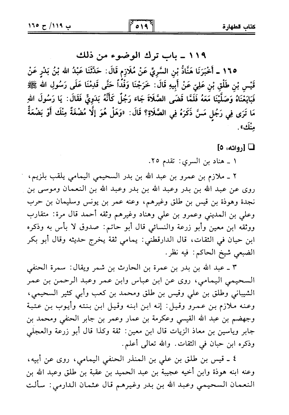 2 - ملازم بن عمرو بن عبد الله بن بدر السحيمي اليمامي يلقب بلزيم، روى عن عبد الله بن بدر وعبد الله بن بدر وعبد الله بن النعمان وموسى بن نجدة وهوذة بن قيس بن طلق وغيرهم، وعنه عمر بن يونس وسليمان بن حرب وعلي بن المديني وعمرو بن علي وهناد وغيرهم وثقه أحمد قال مرة: متقارب ووثقه ابن معين وأبو زرعة والنسائي قال أبو حاتم: صدوق لا بأس به وذكره ابن حبان في الثقات، قال الدارقطني: يمامي ثقة يخرج حديثه وقال أبو بكر الضبعي شيخ الحاكم: فيه نظر.